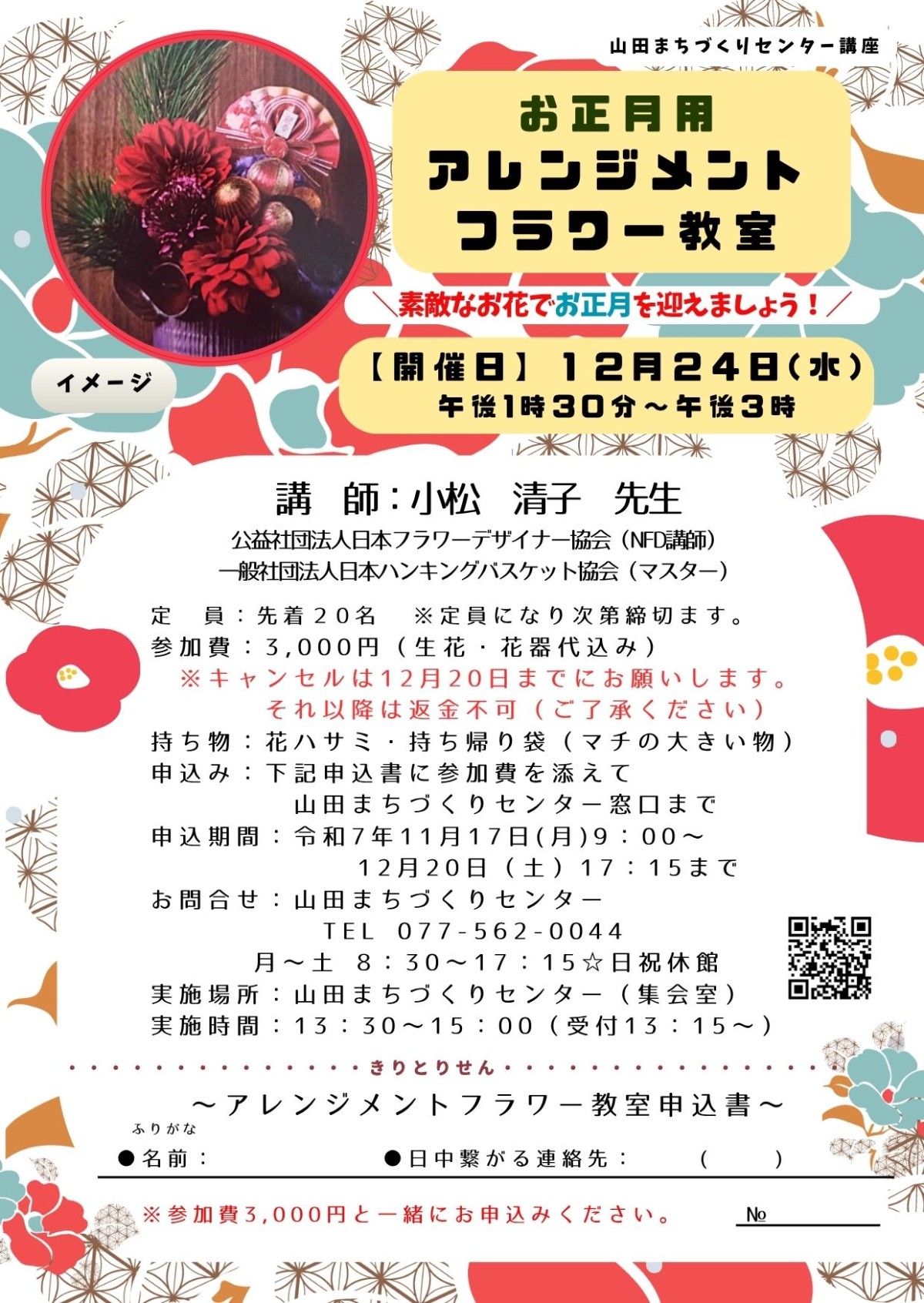 12月24日(水)新春に向けてのアレンジメントフラワー教室を開催します。皆様が集まるお部屋などに!衛生的でお手入れも手軽です。新年の幕開けは素敵なお花で迎えましょう!お気軽にご参加してください。