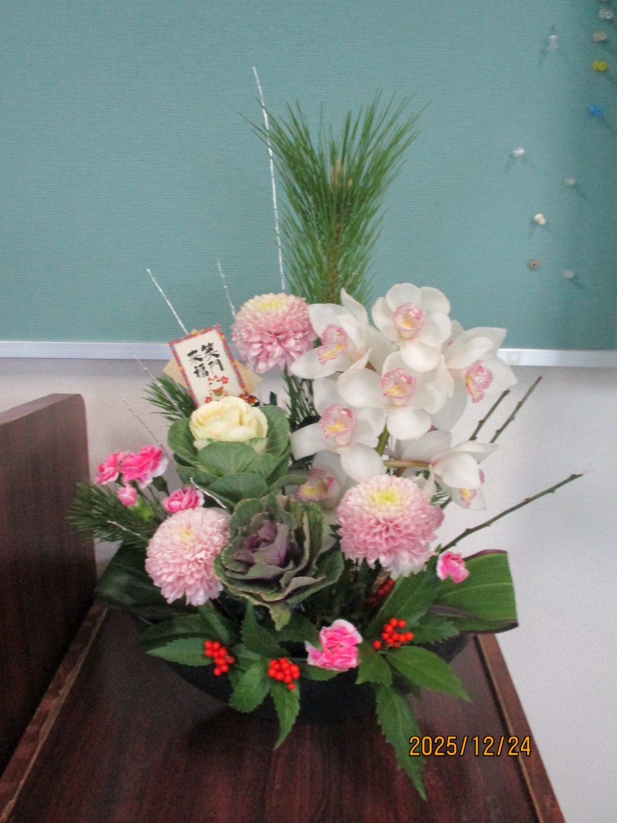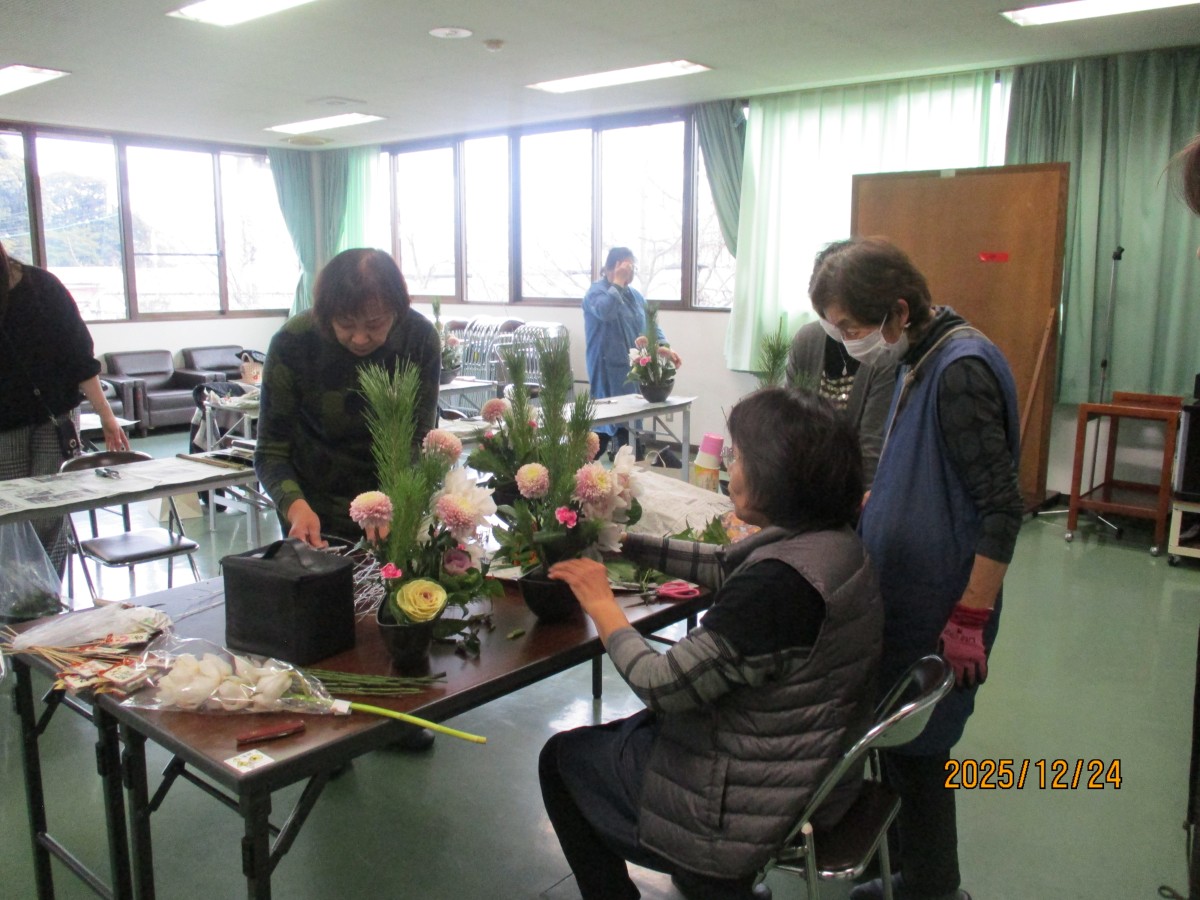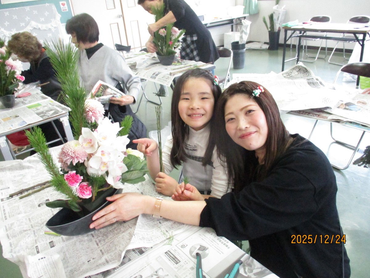 12月24日、小松清子先生の親切丁寧なご指導によりお正月用アレンジメントフラワー教室を参加者12名で開催しました。お正月ならではの松・千両・葉牡丹等の他に豪華なシンピジュームも入り想像以上に豪華な作品となりました。お子様とお母さまの微笑ましい体験風景など癒し空間を皆様と共有できました。手作りのアレンジメントフラワーで新年を迎えられるお手伝いとなったのではないでしょうか?アンケート結果より参加者全員から満足できたとのお声をいただいたり、この場でお友達になりましたと交流の場になったことも大変良かったと思います。