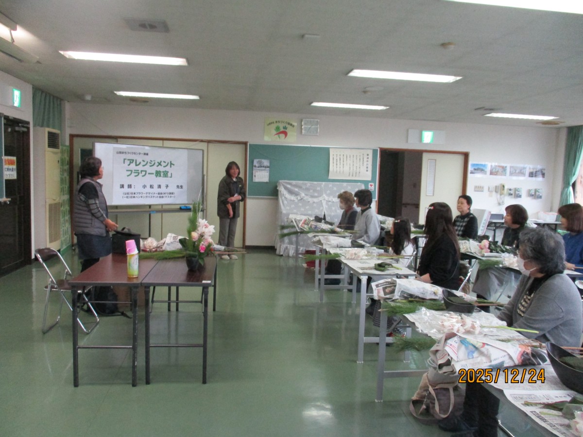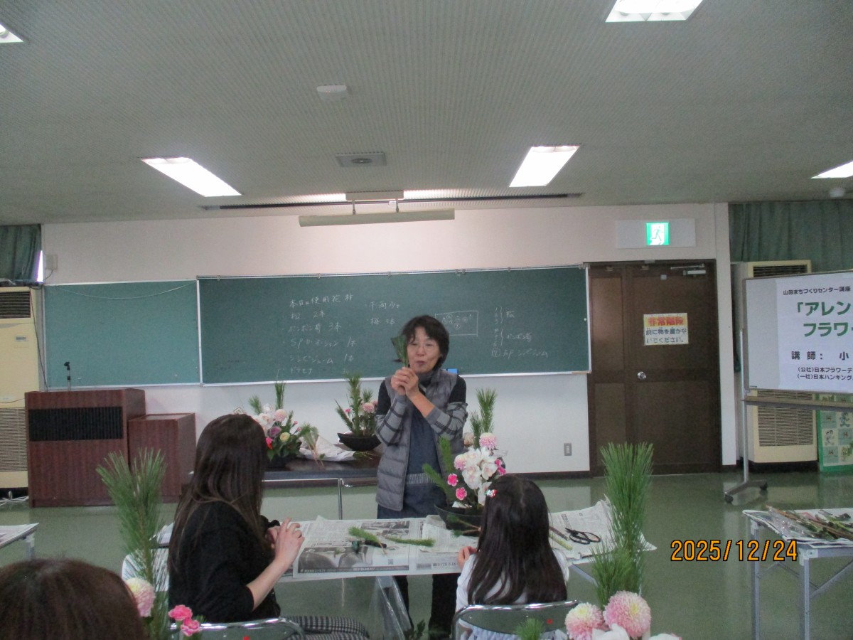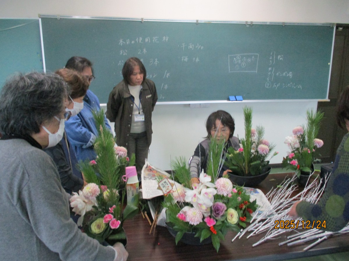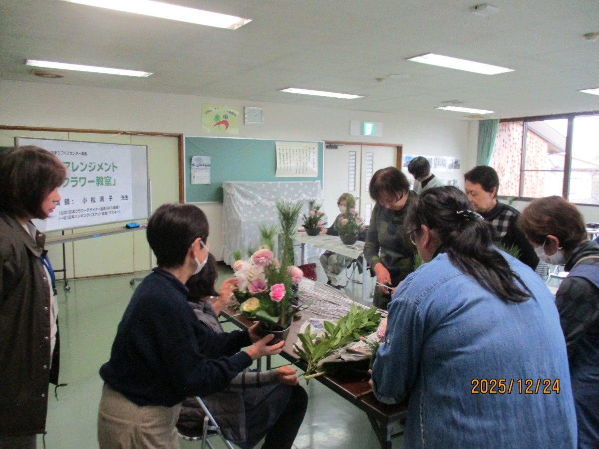12月24日、小松清子先生の親切丁寧なご指導によりお正月用アレンジメントフラワー教室を参加者12名で開催しました。お正月ならではの松・千両・葉牡丹等の他に豪華なシンピジュームも入り想像以上に豪華な作品となりました。お子様とお母さまの微笑ましい体験風景など癒し空間を皆様と共有できました。手作りのアレンジメントフラワーで新年を迎えられるお手伝いとなったのではないでしょうか?アンケート結果より参加者全員から満足できたとのお声をいただいたり、この場でお友達になりましたと交流の場になったことも大変良かったと思います。