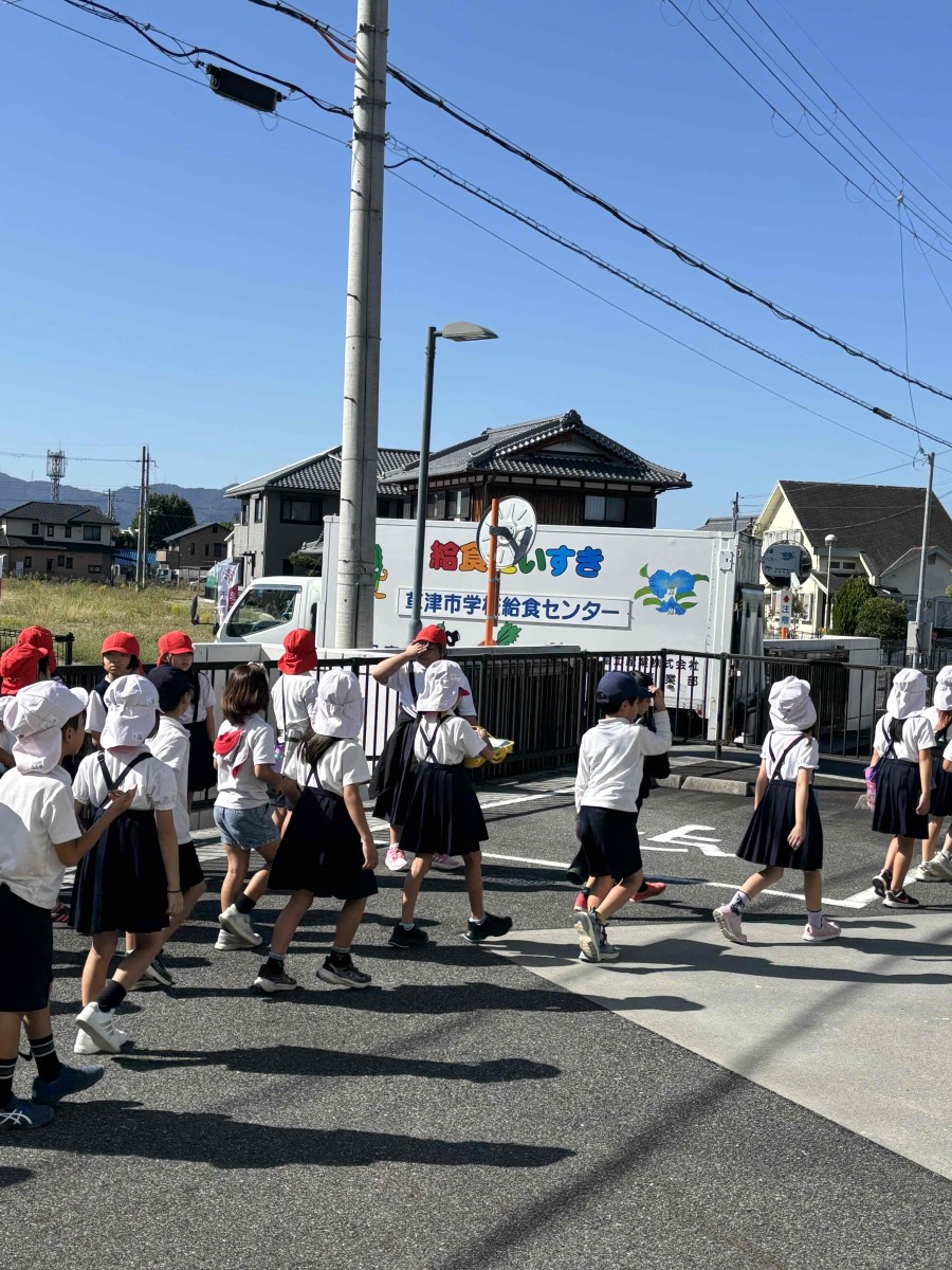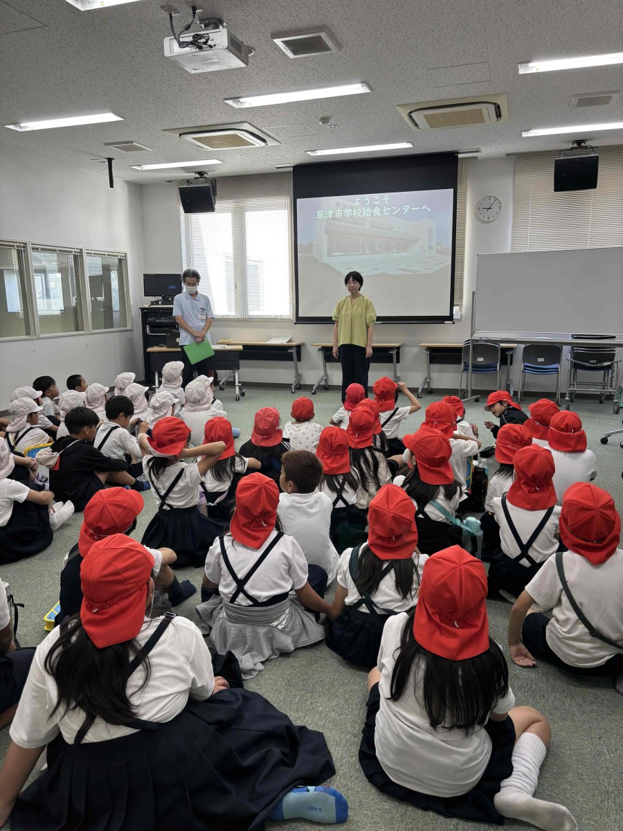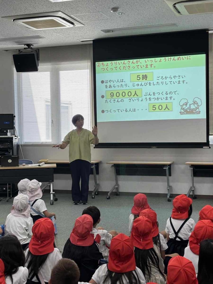 10月17日2年生が給食センターの見学をしました。初めにセンター所長さんからご挨拶があり、続いて栄養教諭の先生からのお話を聞きました。ここでは約9,000人分の給食を作っていて、朝5時から野菜を切ったりご飯を炊いたりして準備が始まり、11時には各小学校へ運び届けているそうです。調理員さんは役割ごとにエプロンや帽子、靴の色が分けられていました。また、献立を作る栄養士さんや給食を運ぶトラック運転手さんなど多くの方々がお仕事されていました。調理の様子を見学させてもらうと大きな大きなお鍋に入った材料を大きなしゃもじでかき混ぜておられました。しゃもじは子ども達の背の高さ程あって持つだけでもたいへんでした。毎日こんな風にして美味しい給食を作ってくださっているんだという事がわかりました。明日からまた感謝して、残さず食べないといけないなぁと子ども達は実感したことと思います。