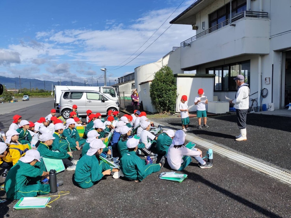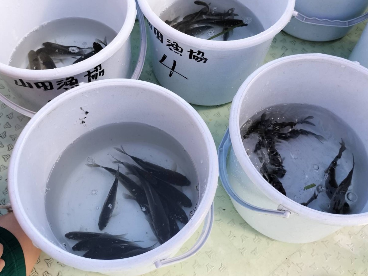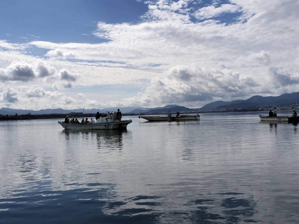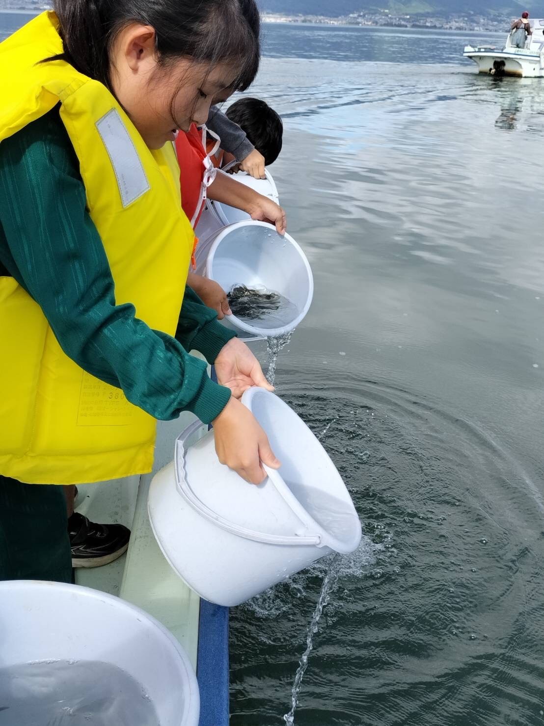 10月20日、4年生が北山田漁港でフナの稚魚放流の体験をしました。ここ20年近く、漁業組合の漁師さん達のご協力のもと行われているもので、県内でも山田小の子ども達だけが体験させていただいているのだそうです。有難いですね。漁港から4隻の漁船に分乗して南の方に出ました。他の船の友達に手を振ったり、水鳥を見て歓声をあげたりして、それだけでも充分楽しそうでした。途中の湖上で、2月頃から育てられているというフナの稚魚を受け取り、一人ずつバケツにもらって、船上から放流しました。その後、琵琶湖に増えてきた水草取りの作業の様子を見学しました。下船後は、県の水産課の方から「南湖再生活動」についてお話をお聞きしました。琵琶湖の12分の1に当たる南湖の問題点(湖岸の整備、水草の増加、湖底の泥質化、外来魚の増加など)を話されました。これらの問題を解決するにはどうしたらよいか考えるのも、今後の学習課題になりそうです。5年生になったら、学習船うみのこに乗り、北湖にも出て行きます。その時に今回の体験を思い出してくれるといいなと思います。日本一の琵琶湖を守るために、漁業者さん他、あらゆる方面で奮闘されている方々の存在を心に留めて置いてほしいものです。貴重な体験にご協力くださった方々に感謝申し上げます。