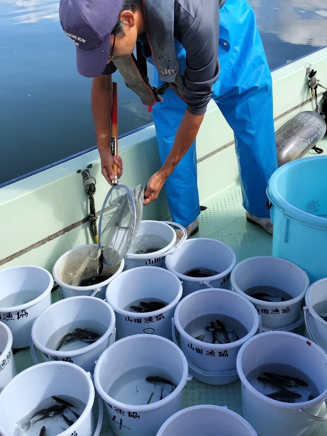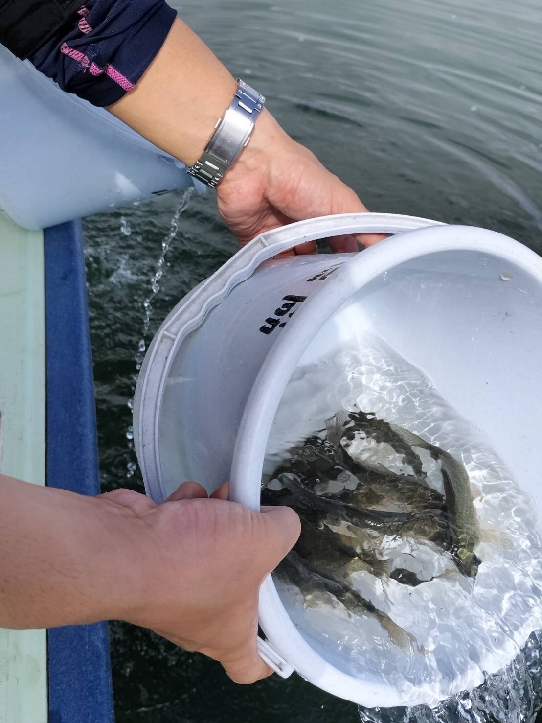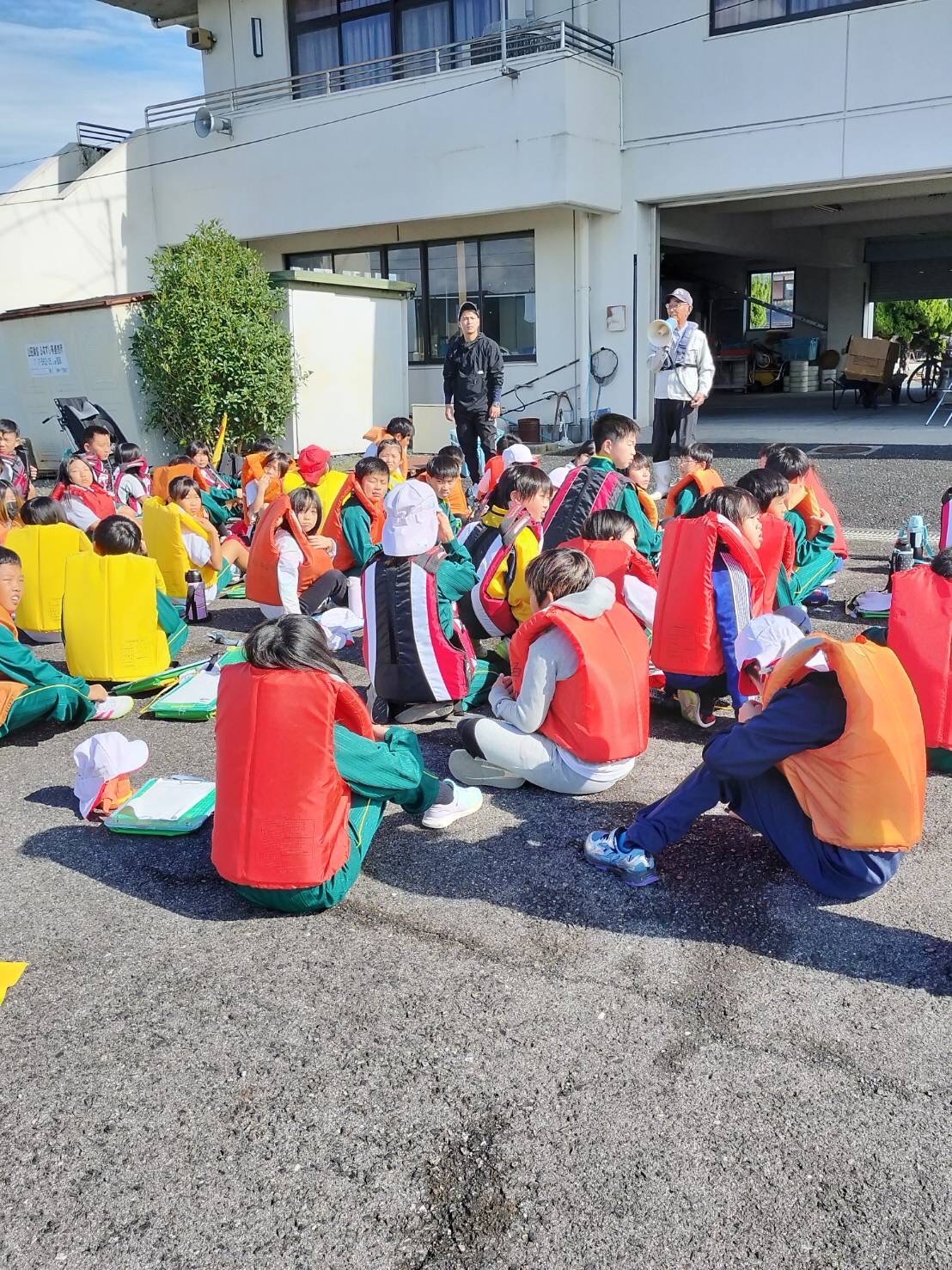 10月20日、4年生が北山田漁港でフナの稚魚放流の体験をしました。ここ20年近く、漁業組合の漁師さん達のご協力のもと行われているもので、県内でも山田小の子ども達だけが体験させていただいているのだそうです。有難いですね。漁港から4隻の漁船に分乗して南の方に出ました。他の船の友達に手を振ったり、水鳥を見て歓声をあげたりして、それだけでも充分楽しそうでした。途中の湖上で、2月頃から育てられているというフナの稚魚を受け取り、一人ずつバケツにもらって、船上から放流しました。その後、琵琶湖に増えてきた水草取りの作業の様子を見学しました。下船後は、県の水産課の方から「南湖再生活動」についてお話をお聞きしました。琵琶湖の12分の1に当たる南湖の問題点(湖岸の整備、水草の増加、湖底の泥質化、外来魚の増加など)を話されました。これらの問題を解決するにはどうしたらよいか考えるのも、今後の学習課題になりそうです。5年生になったら、学習船うみのこに乗り、北湖にも出て行きます。その時に今回の体験を思い出してくれるといいなと思います。日本一の琵琶湖を守るために、漁業者さん他、あらゆる方面で奮闘されている方々の存在を心に留めて置いてほしいものです。貴重な体験にご協力くださった方々に感謝申し上げます。