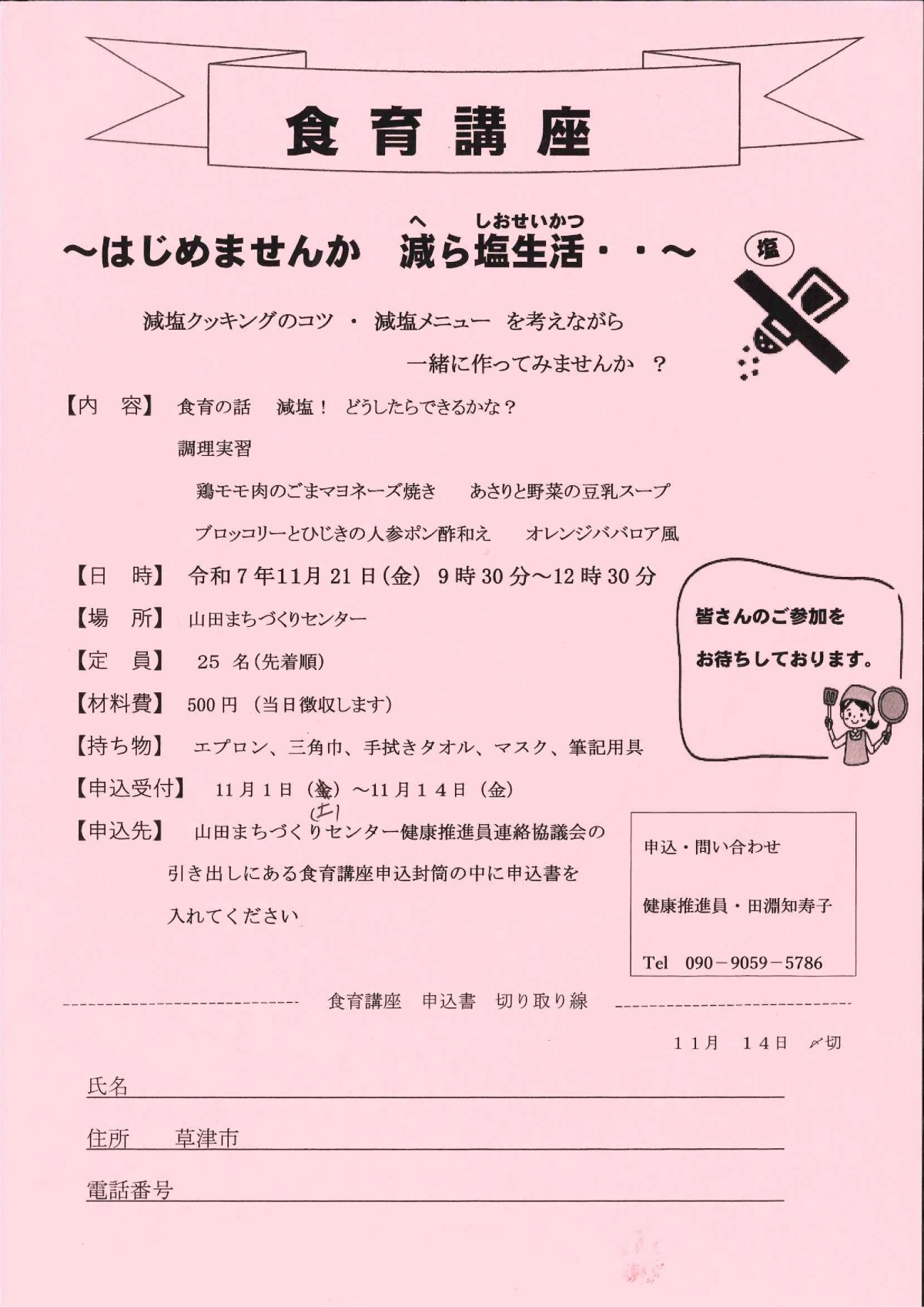 【申込先】山田まちづくりセンター健康推進員連絡協議会の引き出しにある食育講座申込封筒の中に申込書を入れてください