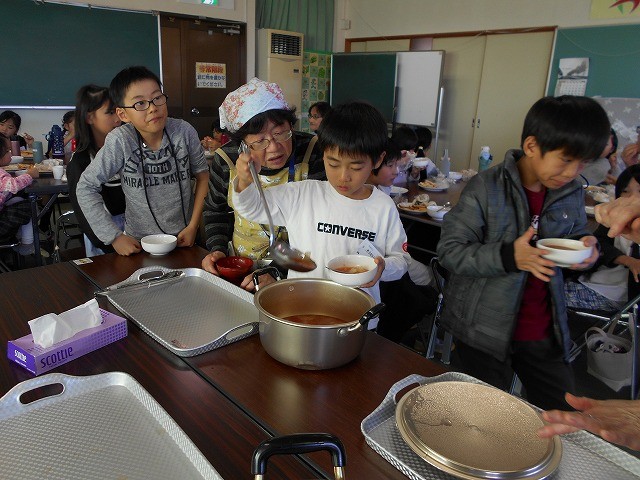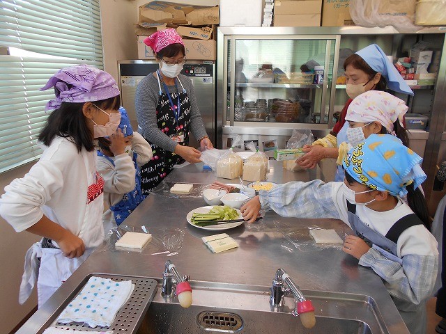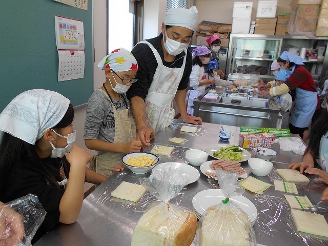 健康推進員の田淵さんの自作による紙芝居仕立て「調理の手順や注意事項」をしっかりと聞いた子ども達は、4班編成2交代でクッキングにGO!