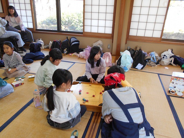 一方、和室では調理の順番を待つ班が様々な遊びに挑戦!今回初めての「カロム」もすぐに遊び方をマスターし、ワイワイと盛り上がります。