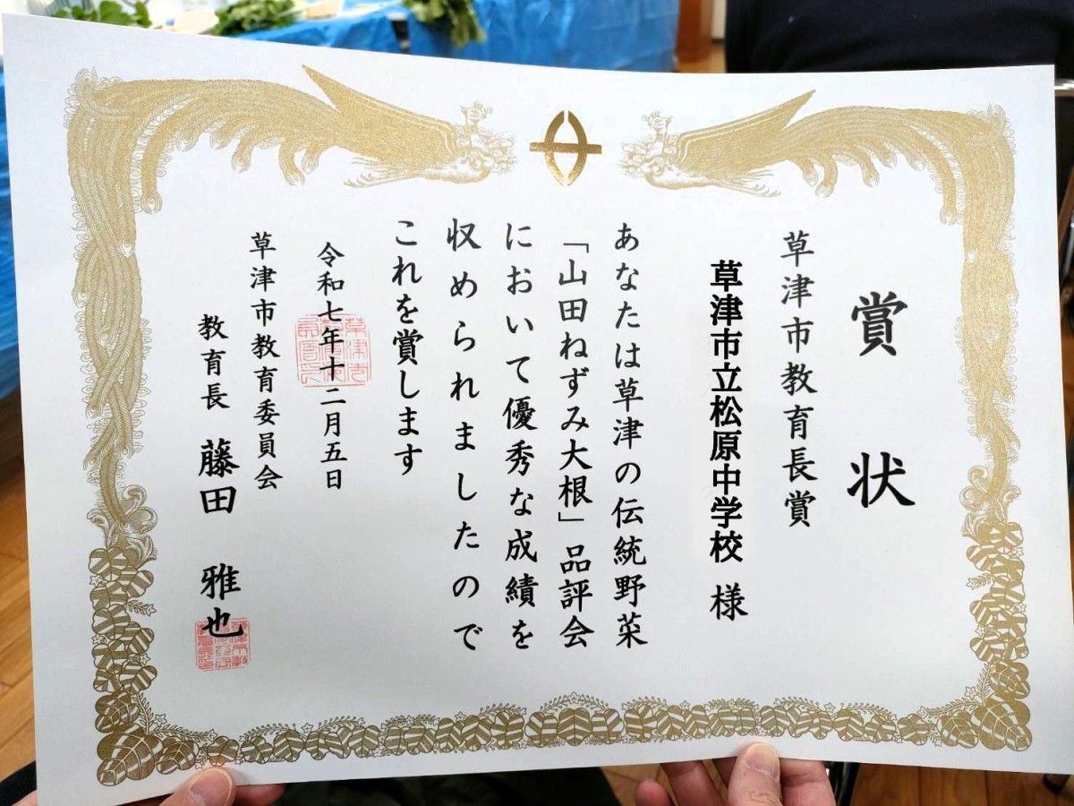 今年は松中においても、草津の伝統野菜である「山田ねずみ大根」の栽培に挑戦!「松原第2ファーム」において9月に種蒔きをし、雑草を取ったり、水を撒いたり、肥料をやったりして大切に世話をしてきました。そして、12月4日、無事に収穫を迎えました。大根の下方が、”ネズミのお尻のような形でしっかりとしたしっぽが付いた”立派な大根がたくさん採れました。この大根を滋賀県立湖南農業高等学校山田ねずみ大根実行委員会主催の「第7回山田ねずみ大根品評会」に出品したところ、見事「教育長賞」を受章いたしました。