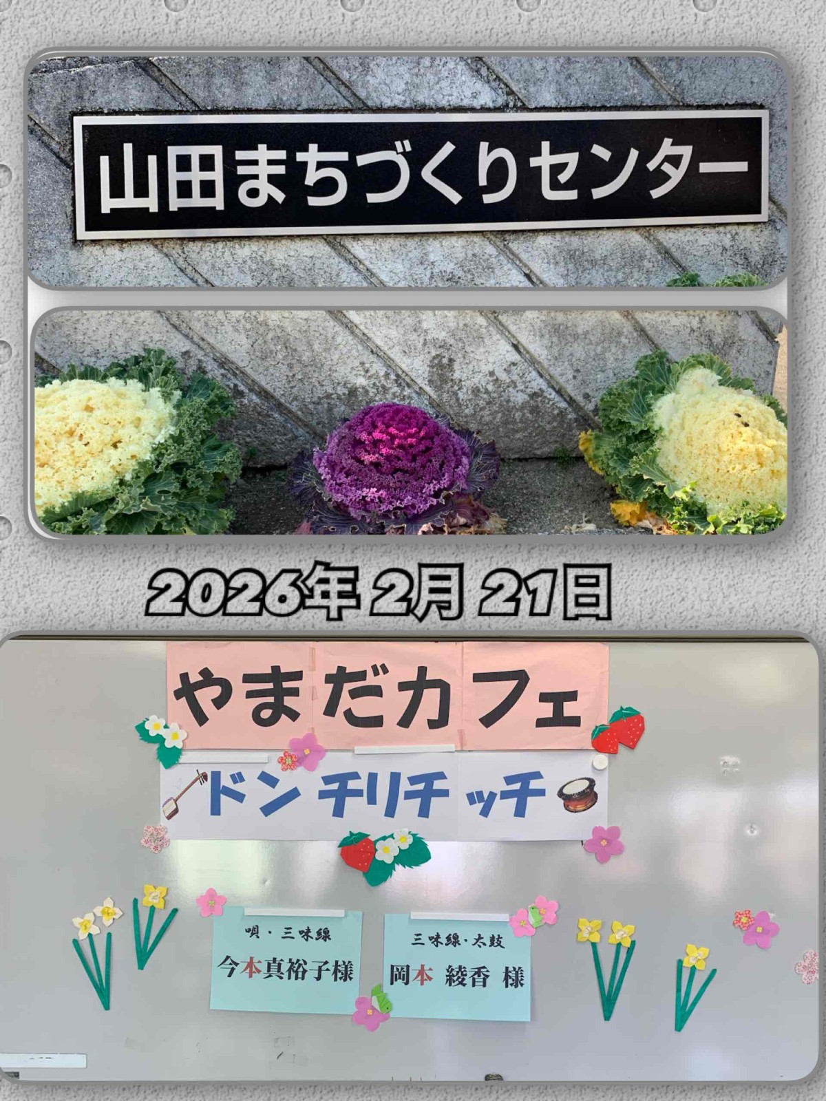 2月21日開催やまだカフェの報告です。本日の来場者は53名・スタッフ14名合計67名でした。大阪からきて頂いた〔ドンチリチッチ〕j女性2名様による唄と三味線、時々太鼓の演奏で会場は大いに盛り上がりました。