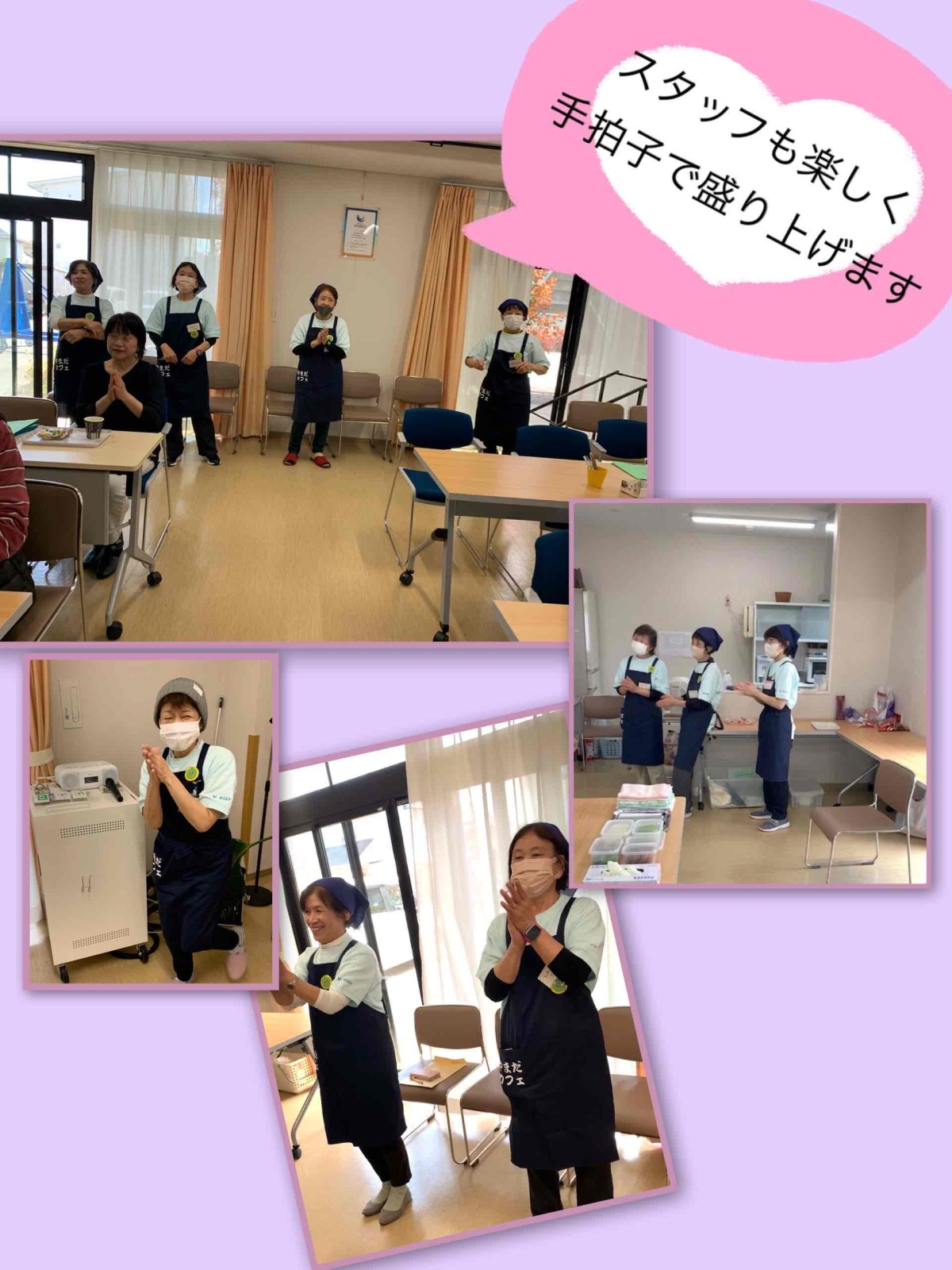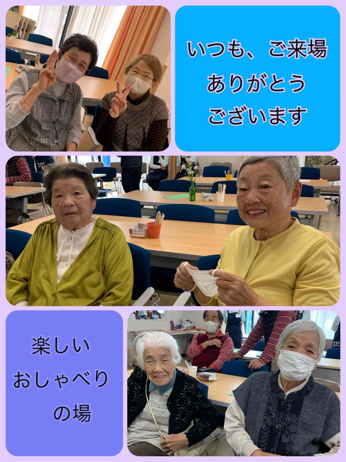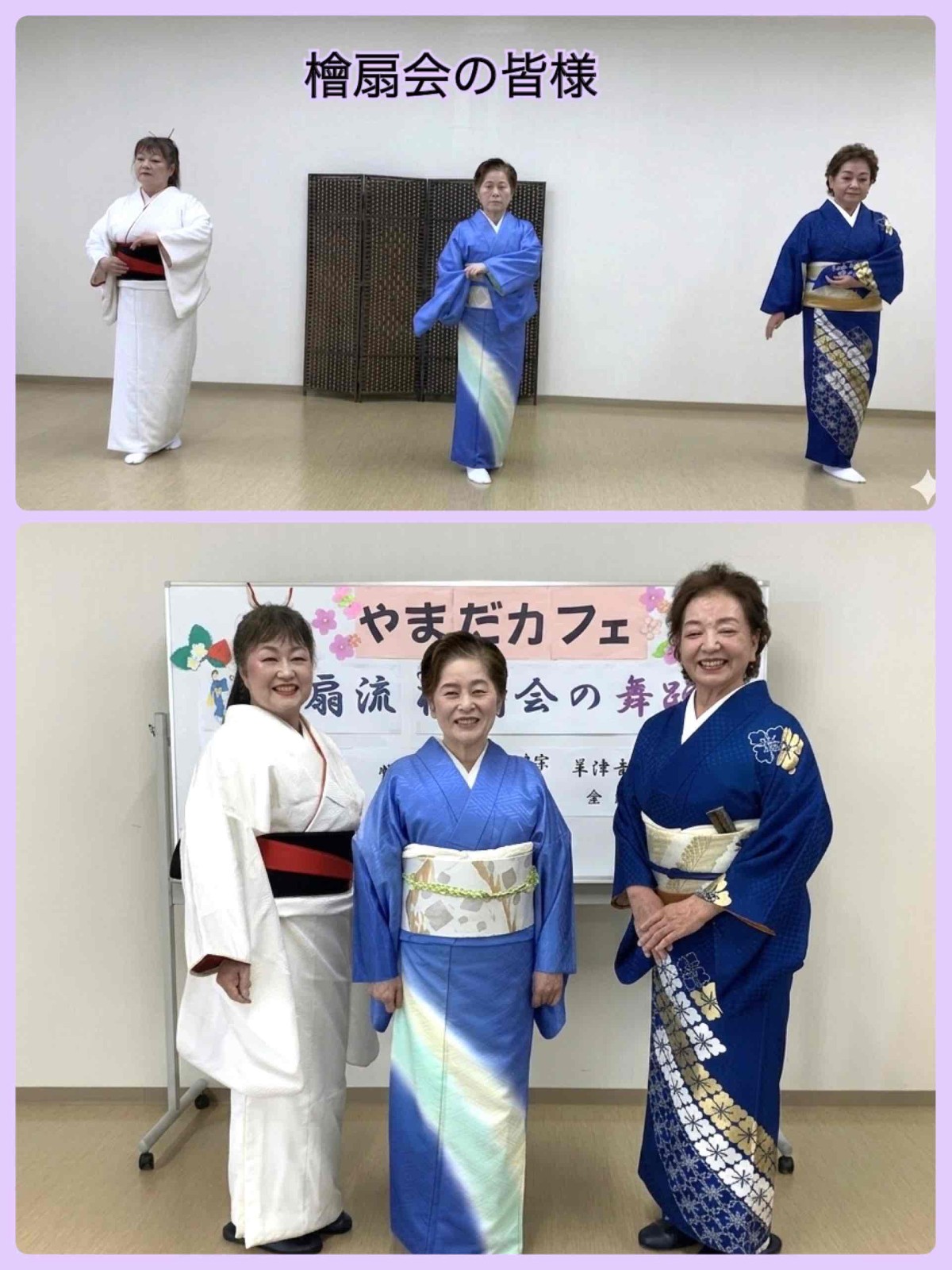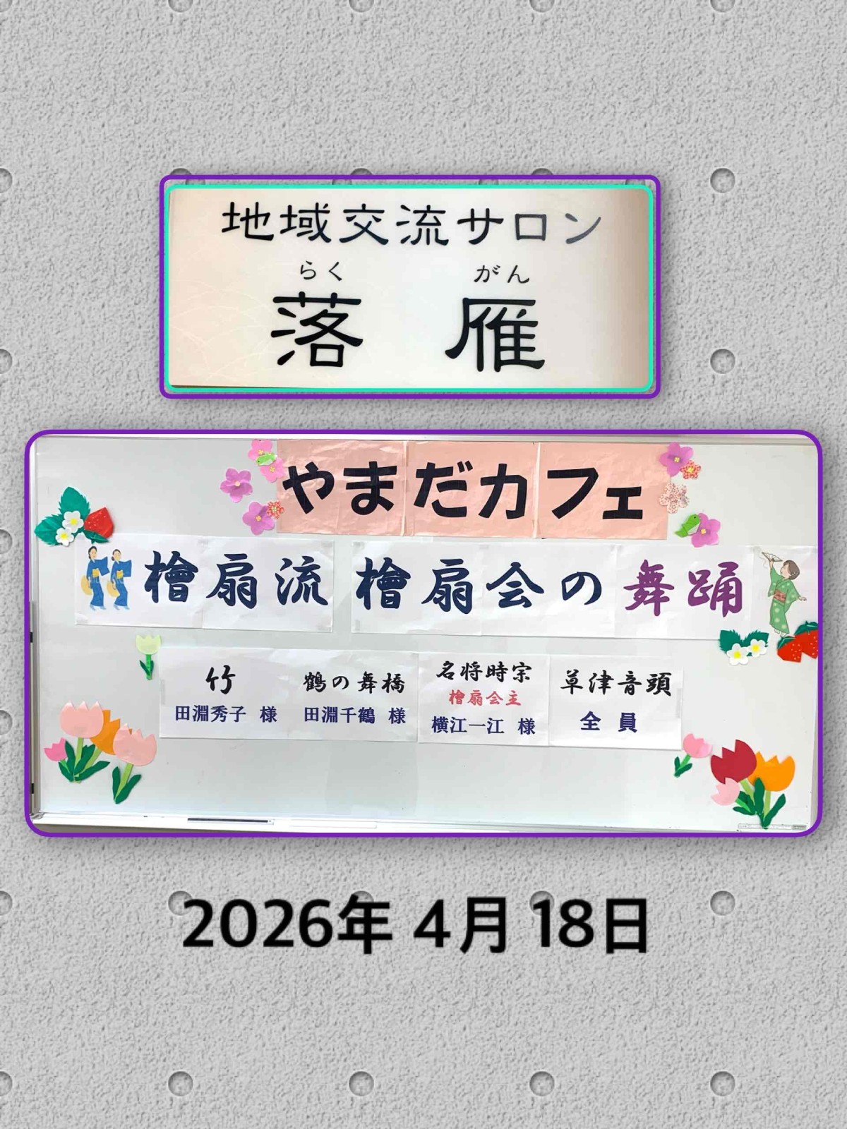 春の日差しが心地よい午後、4月18日に開催されたやまだカフェでは、地域交流サロン「落雁」の場にて、檜扇会の皆様による日本舞踊が披露されました。当日は、来場者50名、施設利用者2名、スタッフ15名、演者3名の合計70名と、多くの方にお越しいただきました。