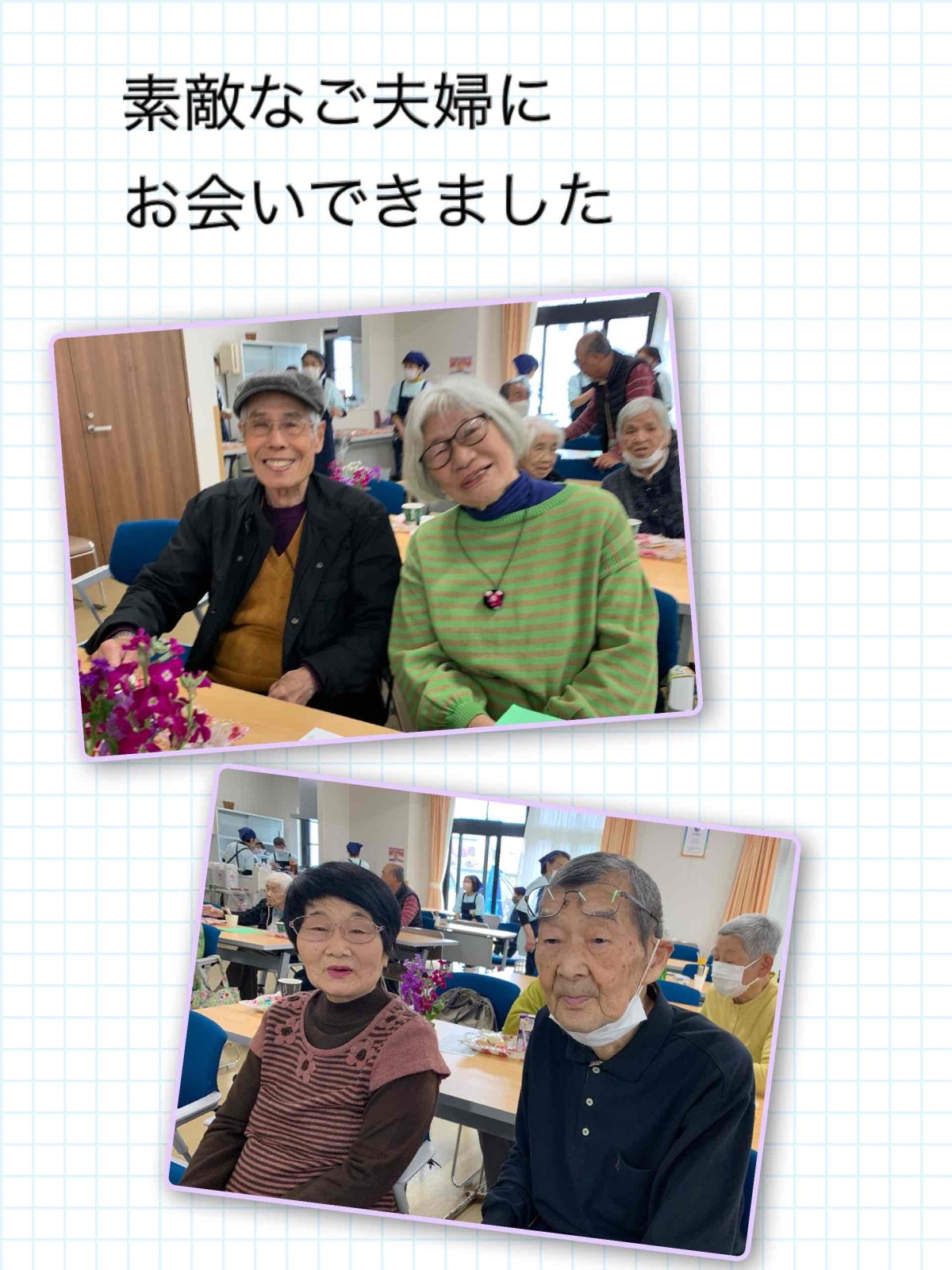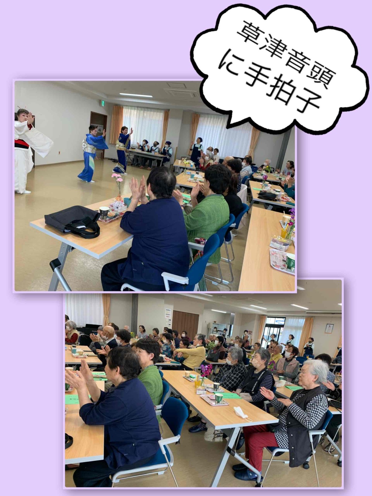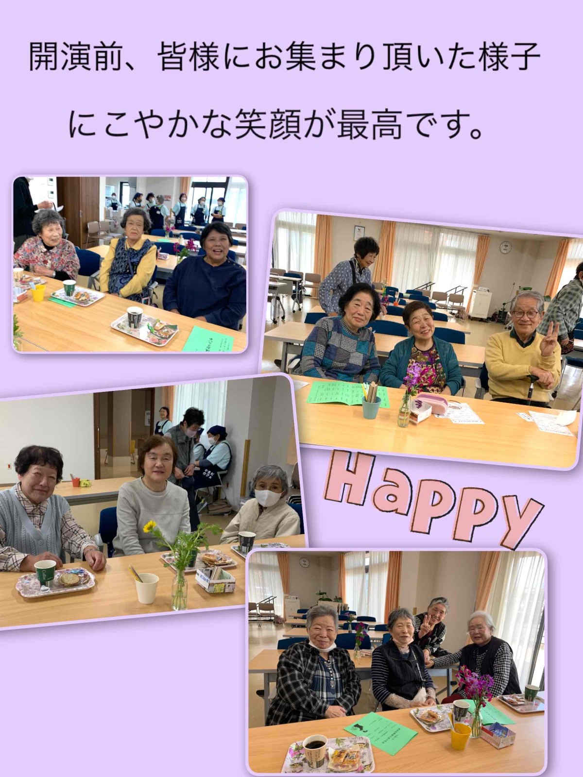 会場は、日本舞踊の華やかな衣装と美しい所作に包まれ、皆さんが真剣なまなざしで舞を鑑賞されている様子がとても印象的でした。早くからお越しいただいた皆様には、写真撮影の許可をいただき、いつもありがとうございます。お知り合い同士や仲良しメンバー、ご夫婦で写真におさまる皆さんの表情はどれも笑顔で、撮影する側も楽しくなります。当日の写真とともに、ここにご報告いたします。これからも、皆さまに楽しんでいただける時間を一緒に過ごしていければ、うれしく思います。