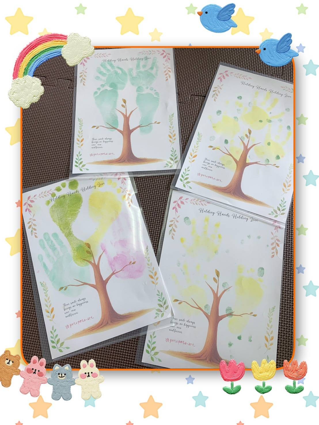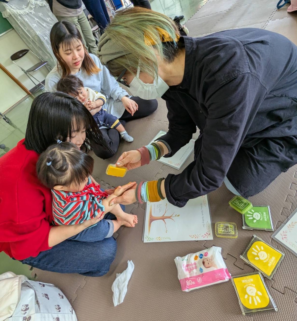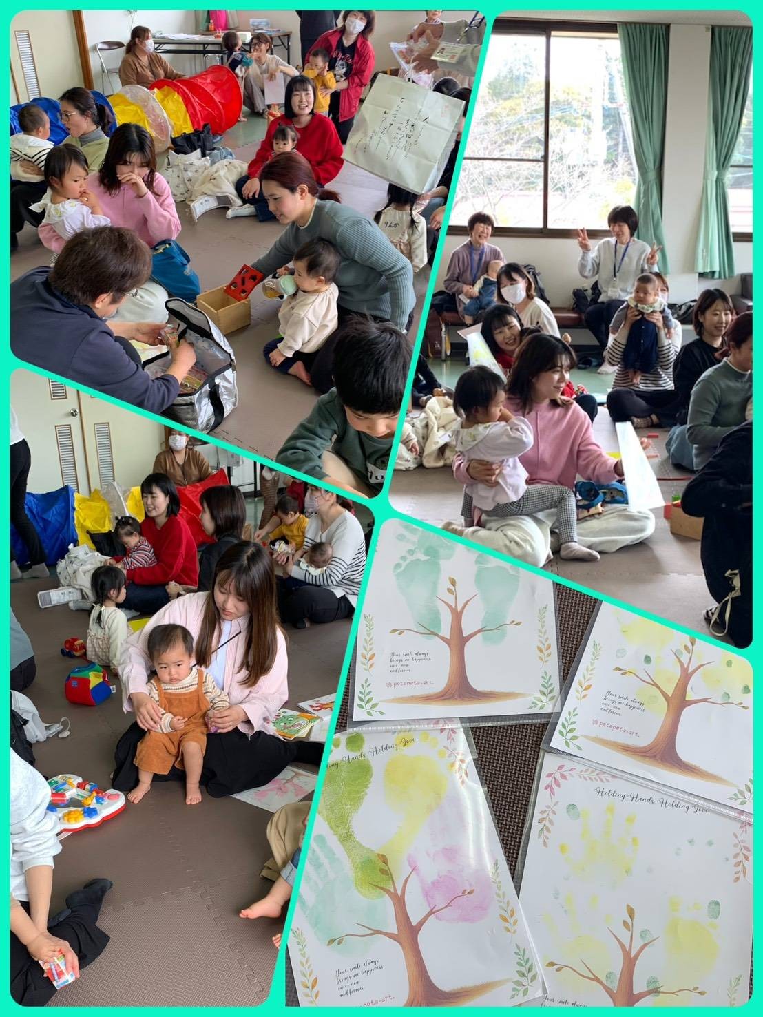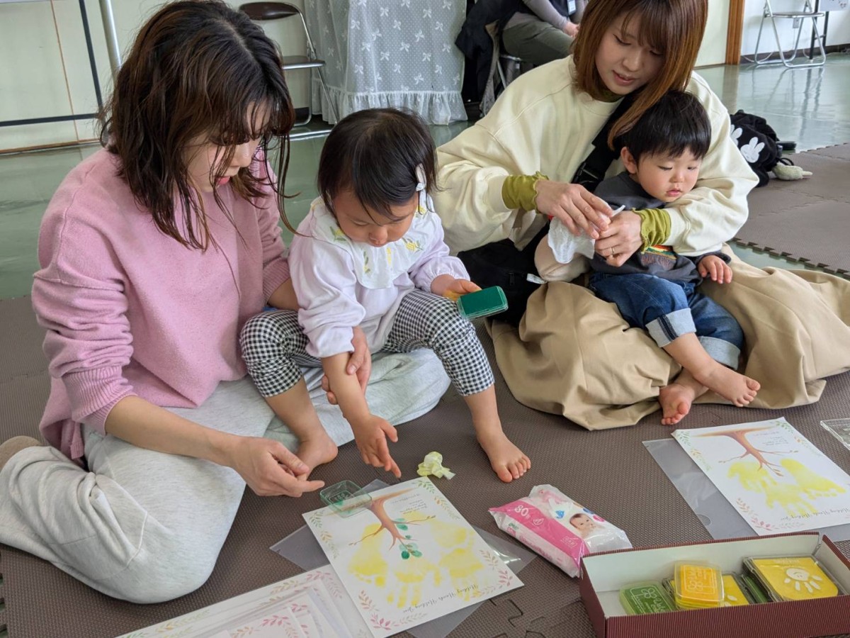 続いて木村景子先生ご指導の手形・足形アートづくり。優し~く絵の具が足の裏に付くと「何が始まるのかな!」ときょろきょろ!でも、台紙にある木に可愛い天使のような手形や足形が写し出されると、もうすっかりアート作品