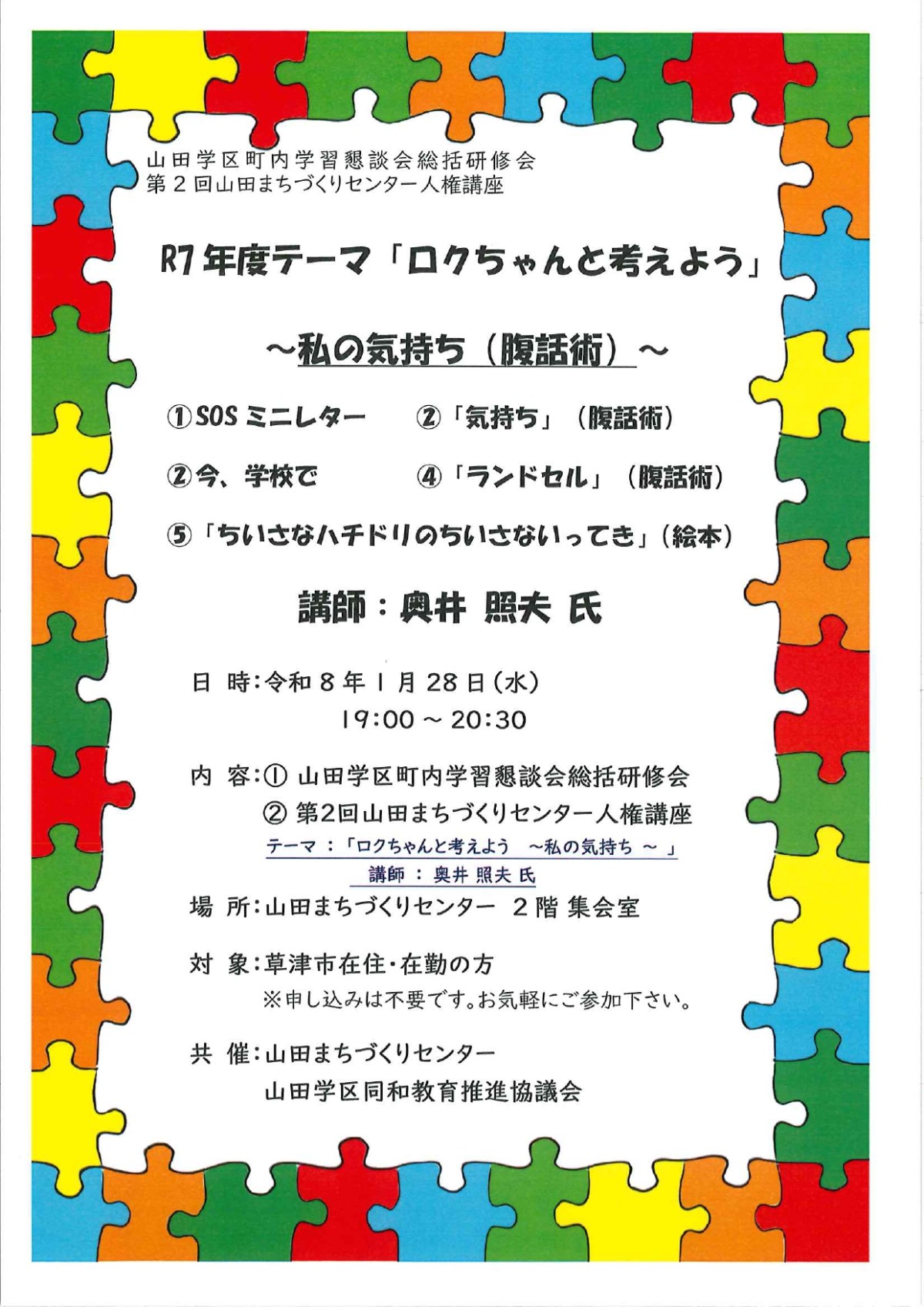 【開催のお知らせ】山田学区町内学習懇談会総括研修会、第2回山田まちづくりセンター人権講座