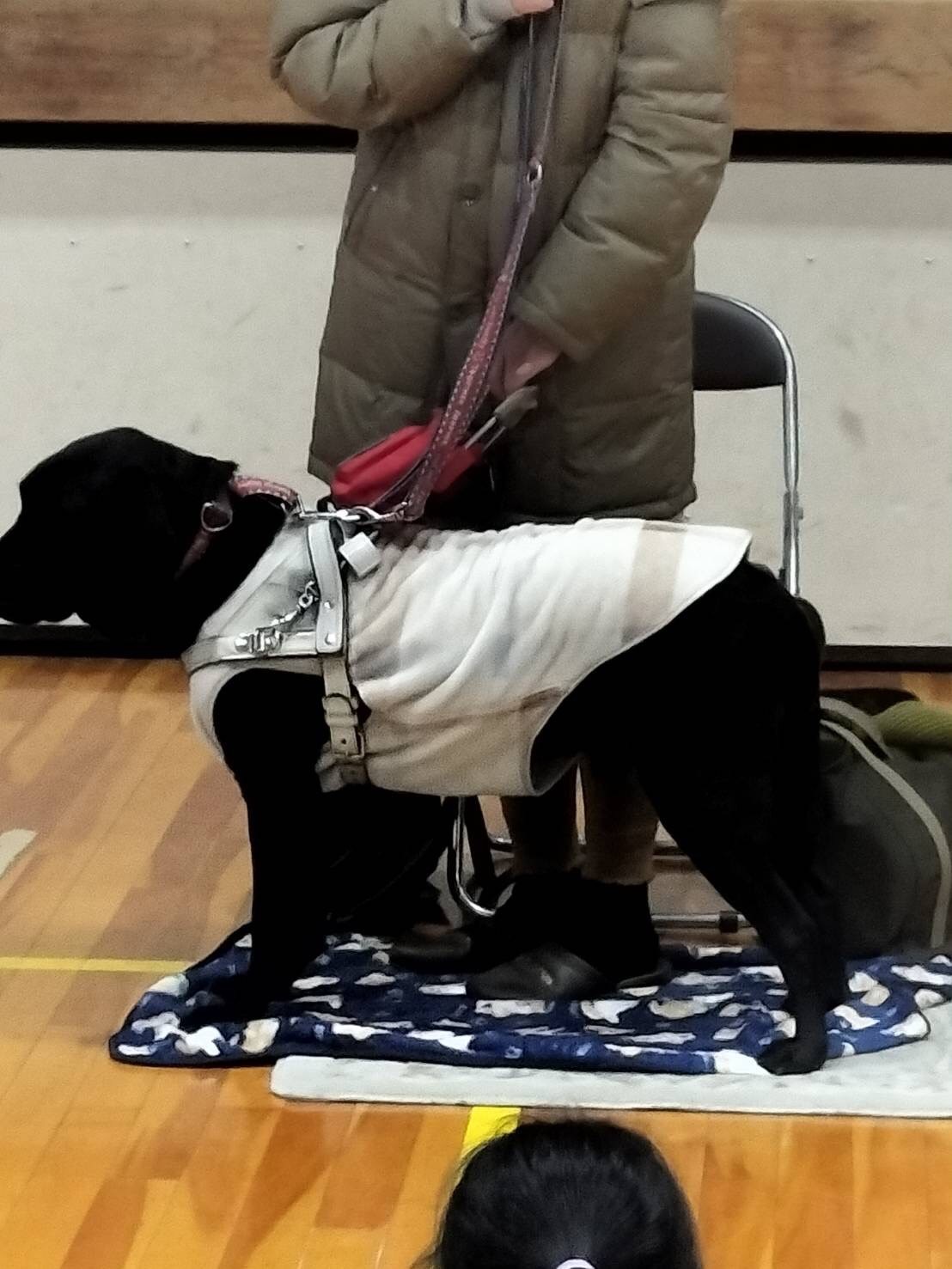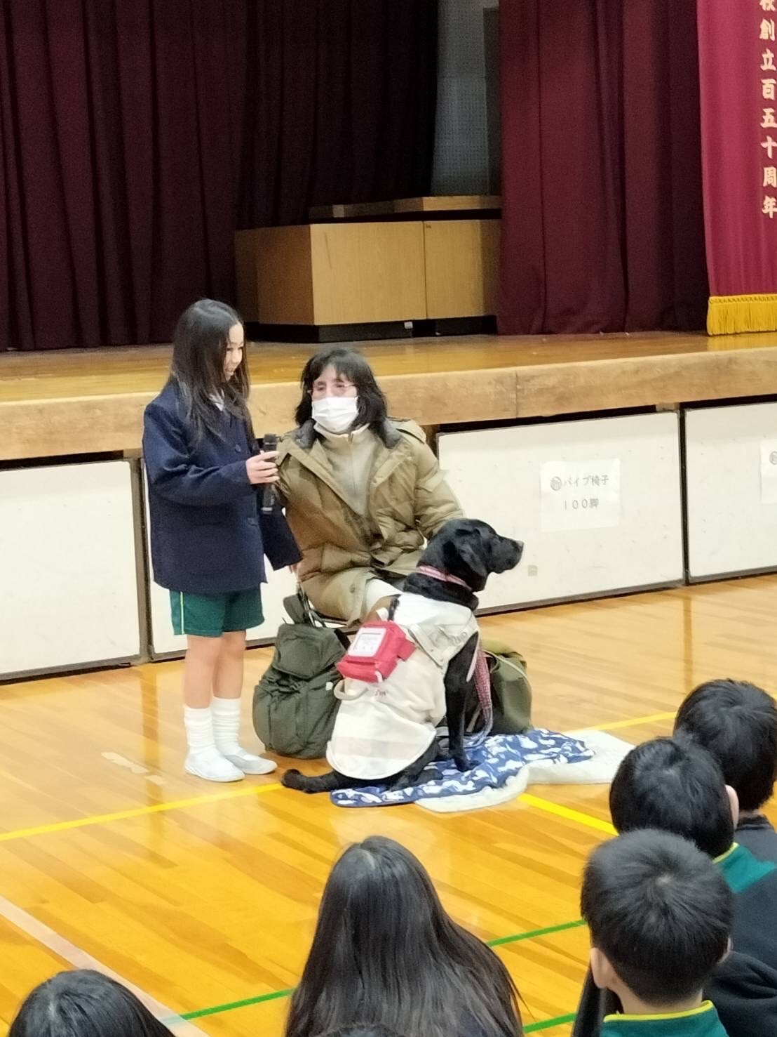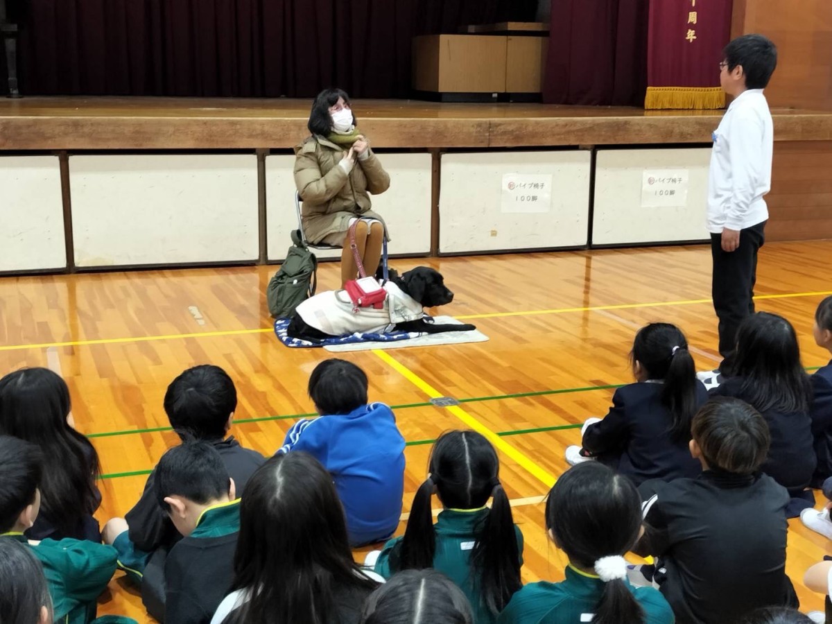 1月20日(火)3年生が『いきいき~やさしい町づくり』で盲導犬と出会おうという学習をしました。大津市在住の前田眞里さんが盲導犬ペリーと共にバスや電車を乗り継いで山田小を訪れてくださいました。前田さんは33歳の時に光も見えない全盲になったそうですが、目で確認できない分は手で確かめられることや周りの様子は音でわかるそうです。音声で時間などを知らせてくれるスマホを活用されていることも見せていただきました。家の中では何がどこにあるのか分かっているので、一人で生活出来ていますが、外出の時は危ないので犬と共に行動しているそうです。犬の背中にハーネスを付け、英語で命令すると、駅の改札、券売機、エレベーター、階段などを教えてくれるように訓練されているというお話でした。でも、字が読めないので、店舗の入口を間違えて案内したこともあり、そんな時は周りの人にお世話になるそうです。ペリーは犬だけど、人の気持ちがよく分かって、前田さんの具合が悪い時は寄り添ってくれる優しい家族、大事なパートナーだというお話に子どもたちも感動した様子でした。白杖を使ったり盲導犬を連れた人が困っている様子を見かけた時は「何かお手伝いしましょうか?」と声をかけて欲しいこと、犬が好きだからと言って盲導犬に触ったり呼びかけたりしないで欲しいことなど、目の不自由な人との接し方もお話されました。最後に代表の子に手を貸してもらって体育館の中を歩いて見せ、介助の仕方を教えてくださいました。盲導犬は排泄も散歩も、周りの人に迷惑をかけないようにきちんと訓練されていることや、家の中では自由にしていることも聞かせていただきました。最近はどこもタッチパネルになっているので、音声案内があるとありがたいというお話では、日常社会生活の中でまだまだ改善されないといけないこともあると痛感しました。ペリーと一体になって動いている前田さんのお話を真剣な眼差しで聴いていた子どもたちの心に、前田さんの言葉がしっかりと刻み込まれ、意義ある時間になったと思います。