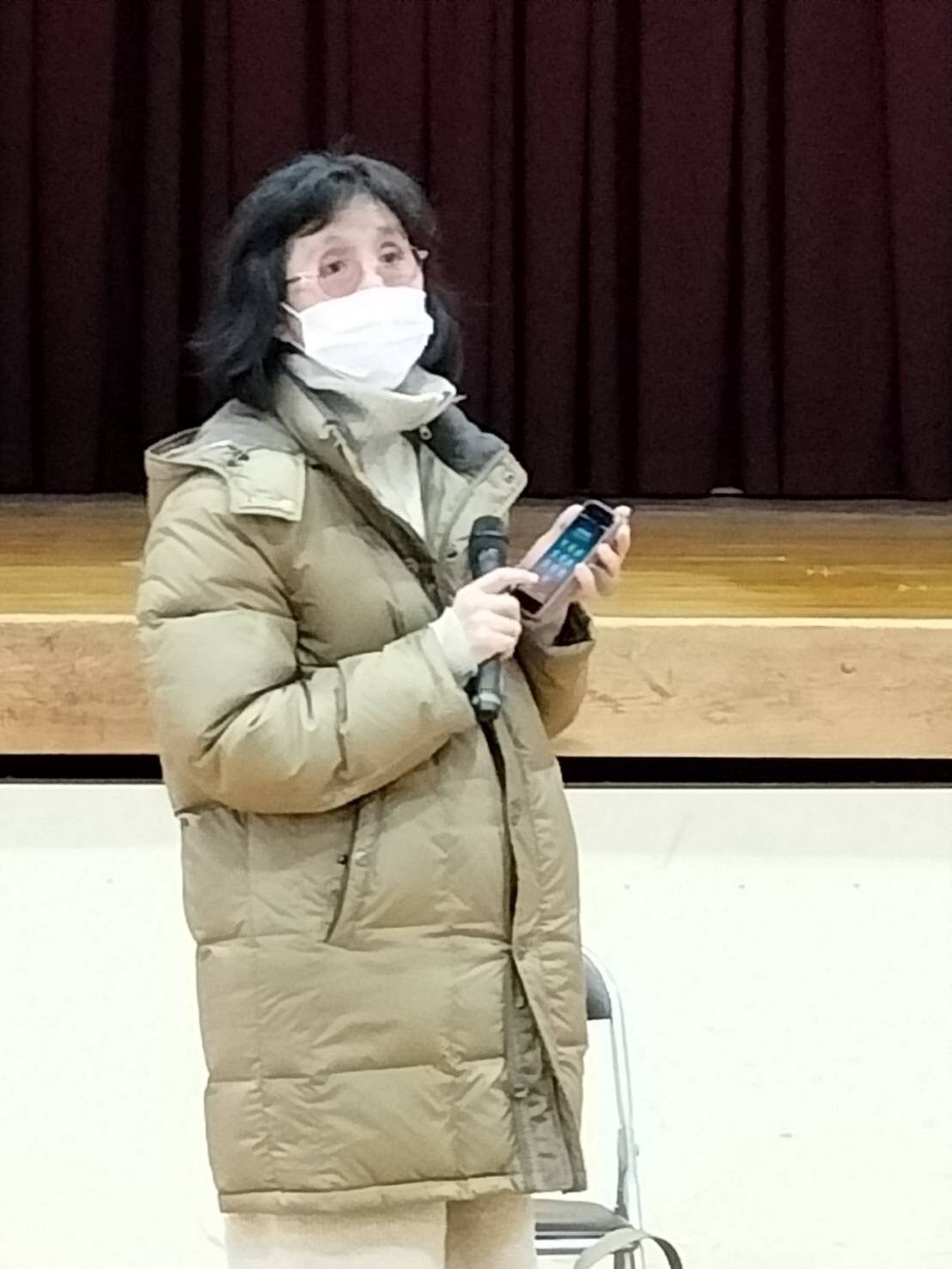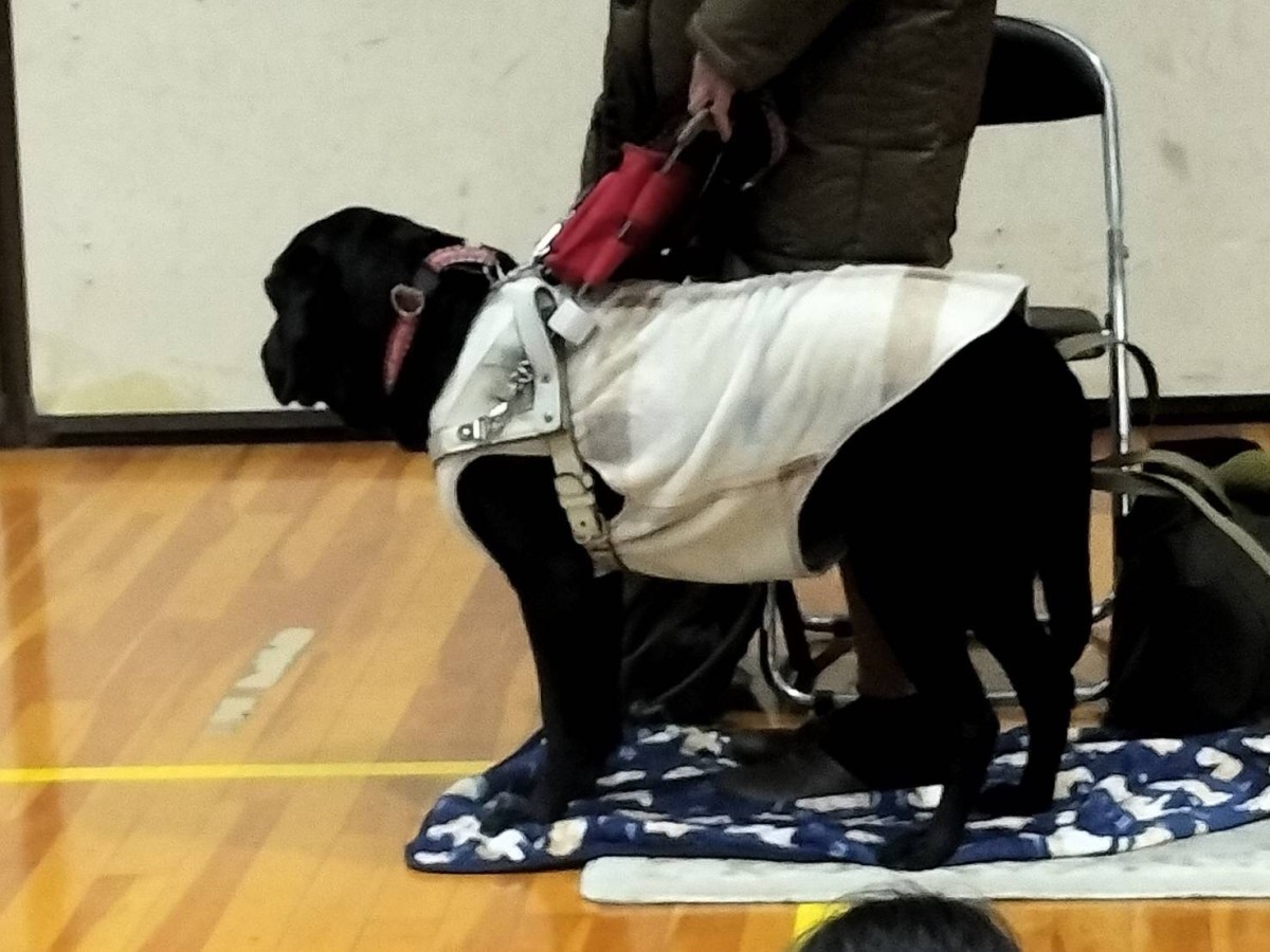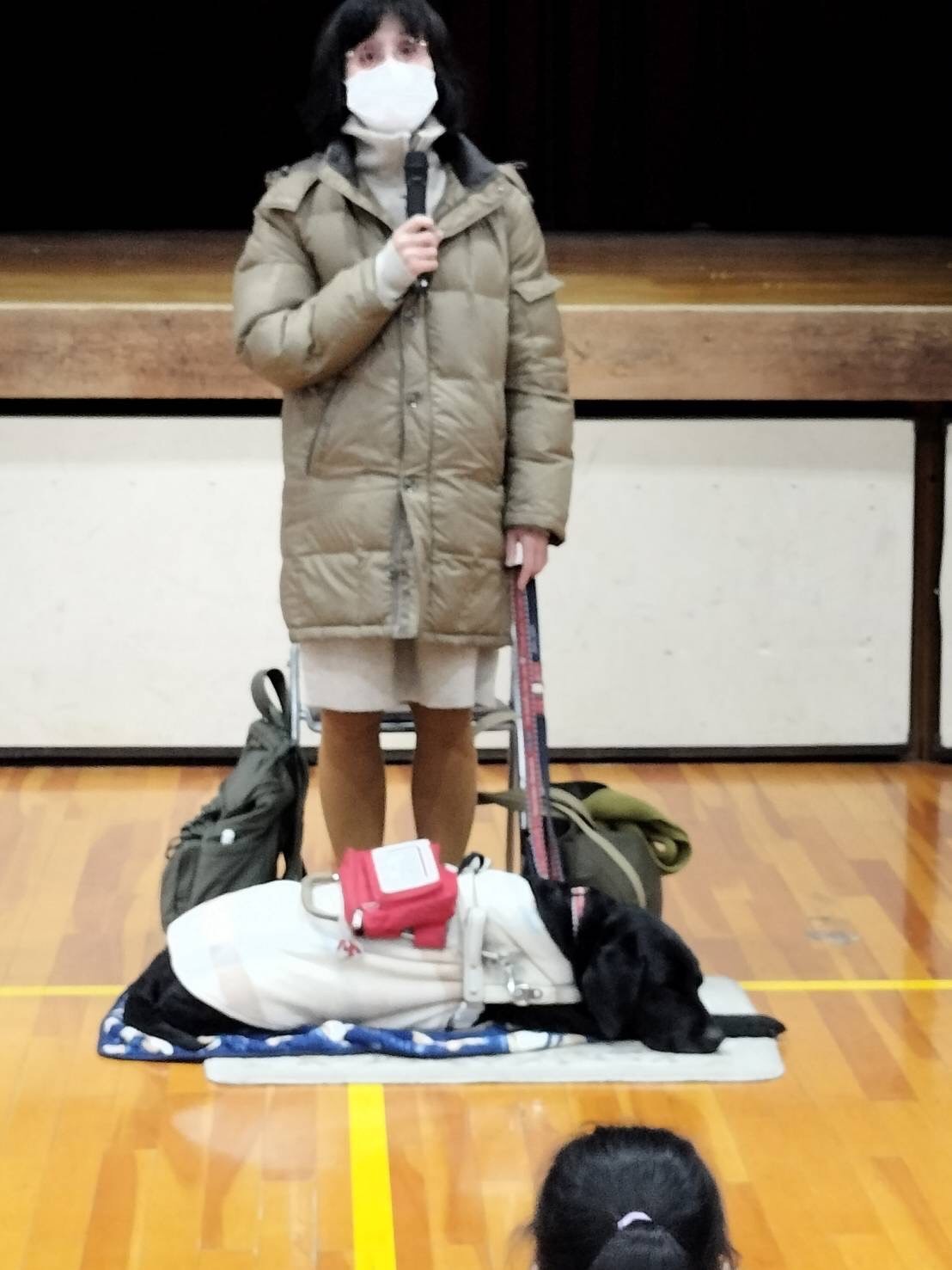 1月20日(火)3年生が『いきいき~やさしい町づくり』で盲導犬と出会おうという学習をしました。大津市在住の前田眞里さんが盲導犬ペリーと共にバスや電車を乗り継いで山田小を訪れてくださいました。前田さんは33歳の時に光も見えない全盲になったそうですが、目で確認できない分は手で確かめられることや周りの様子は音でわかるそうです。音声で時間などを知らせてくれるスマホを活用されていることも見せていただきました。家の中では何がどこにあるのか分かっているので、一人で生活出来ていますが、外出の時は危ないので犬と共に行動しているそうです。犬の背中にハーネスを付け、英語で命令すると、駅の改札、券売機、エレベーター、階段などを教えてくれるように訓練されているというお話でした。でも、字が読めないので、店舗の入口を間違えて案内したこともあり、そんな時は周りの人にお世話になるそうです。ペリーは犬だけど、人の気持ちがよく分かって、前田さんの具合が悪い時は寄り添ってくれる優しい家族、大事なパートナーだというお話に子どもたちも感動した様子でした。白杖を使ったり盲導犬を連れた人が困っている様子を見かけた時は「何かお手伝いしましょうか?」と声をかけて欲しいこと、犬が好きだからと言って盲導犬に触ったり呼びかけたりしないで欲しいことなど、目の不自由な人との接し方もお話されました。最後に代表の子に手を貸してもらって体育館の中を歩いて見せ、介助の仕方を教えてくださいました。盲導犬は排泄も散歩も、周りの人に迷惑をかけないようにきちんと訓練されていることや、家の中では自由にしていることも聞かせていただきました。最近はどこもタッチパネルになっているので、音声案内があるとありがたいというお話では、日常社会生活の中でまだまだ改善されないといけないこともあると痛感しました。ペリーと一体になって動いている前田さんのお話を真剣な眼差しで聴いていた子どもたちの心に、前田さんの言葉がしっかりと刻み込まれ、意義ある時間になったと思います。