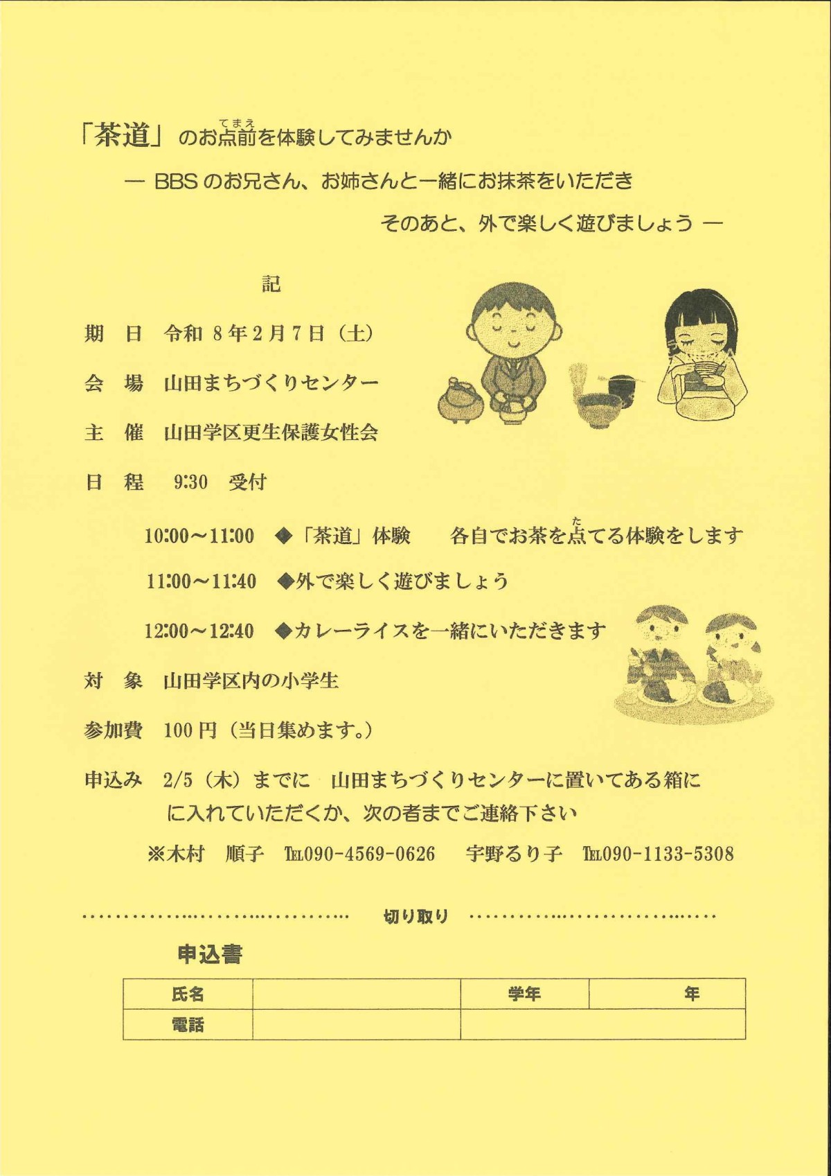 申込み:山田まちづくりセンターに置いてある箱に入れていただくか、下記の担当者までご連絡してください。