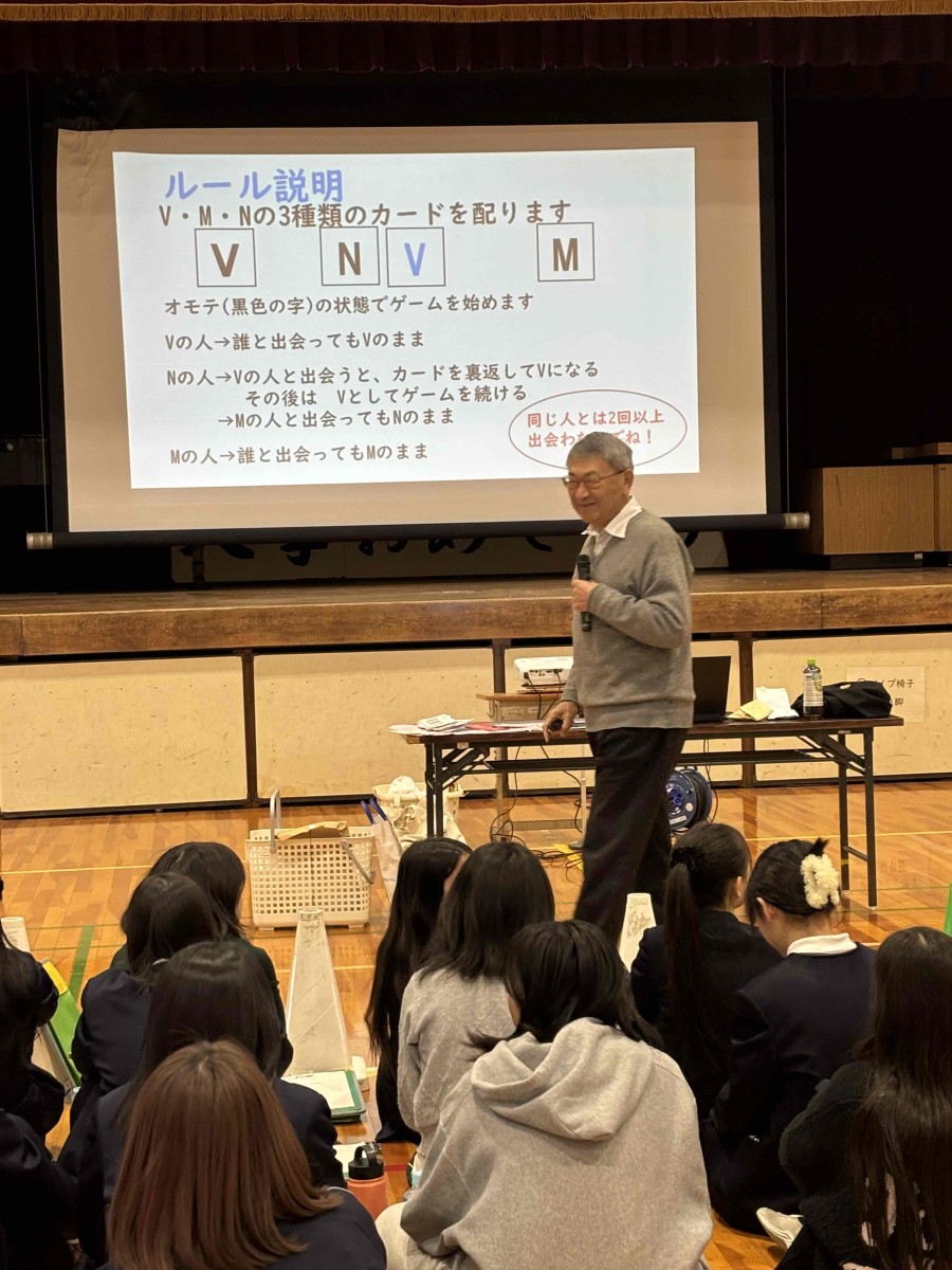 1時間目は、3種類のカードを使ってウイルス感染していく様子をゲームで知ることから始まりました。そして、知っている病気をあげていくと、「感染症」と「生活習慣病」に分けることができました。さらに、感染症が起こる原因や感染症の予防方法について教えていただきました。私達が咳をするとウイルスは2-3m飛び散るらしいですが、実際に3メートルというとかなり広い範囲であることもわかりました。栄養や睡眠をとって体の抵抗力を高め、手洗いやうがい、マスクをして病原体の経路を断ち切る、また煮沸や日光消毒などにより病原体をなくすことが予防になるということです。