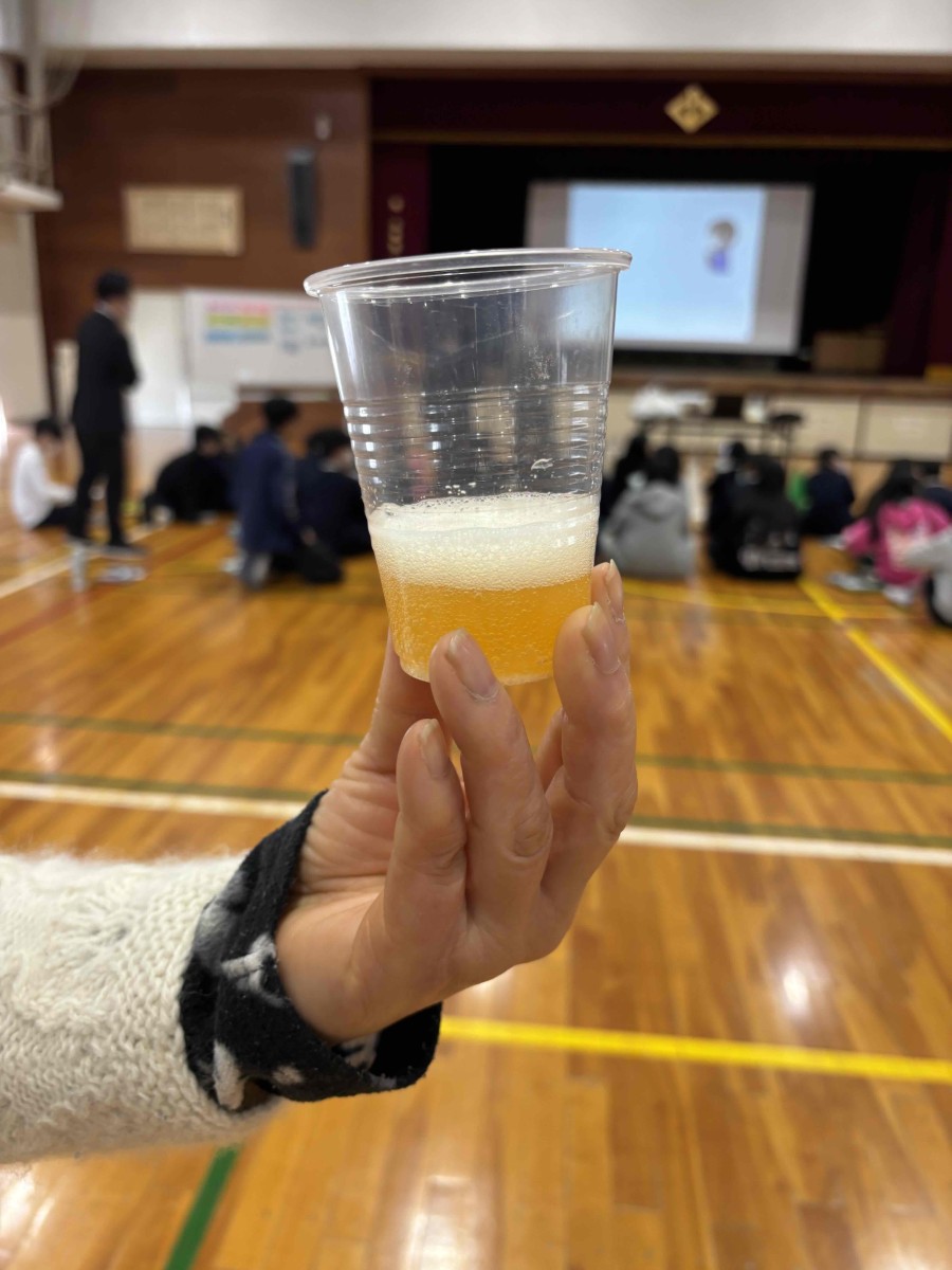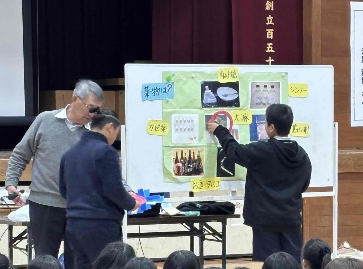 2時間目は、保護者の方々が参観され「薬物乱用」についての学習でした。薬をジュースで飲むとどうなるかをジュースに薬を入れて泡立ってしまう様子で説明してもらいました。これで薬は水で正しく服用しないといけないこともよくわかりました。薬物は、覚醒剤、大麻、コカイン、シンナー等があり、乱用され、又は乱用されるおそれがあるものを指し、様々な薬があるそうです。薬物は一回でも飲むと「乱用」になると先生は何度も語られていました。