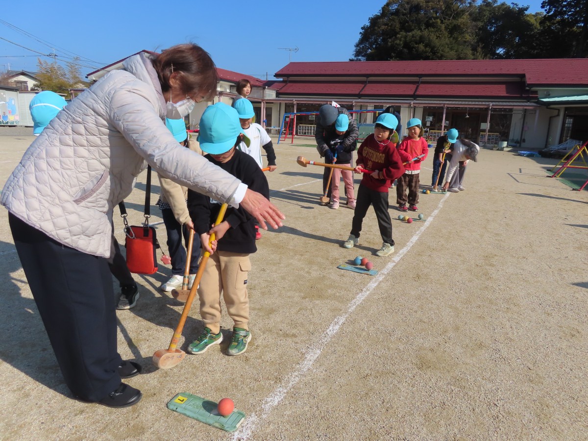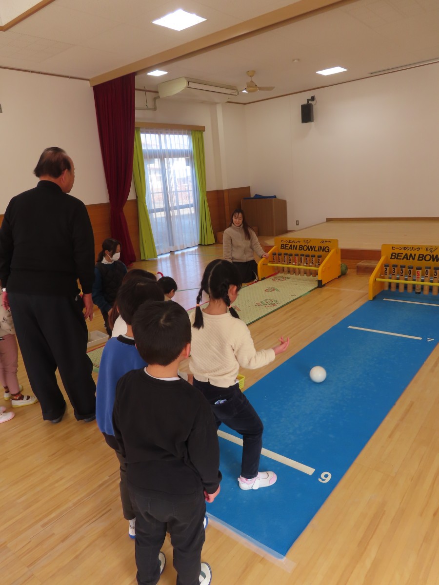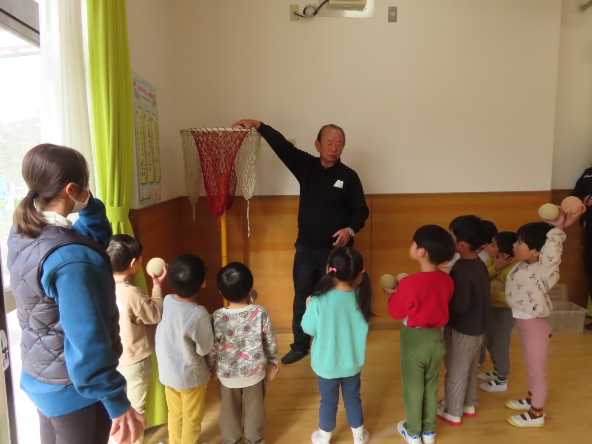 2月13日(金)にニュースポーツ交流会をしました。山田園小教育後援会のみなさんにお越しいただき、3歳児は輪投げとキンボール、4歳児はビーンボウリングとワンツーシュート、5歳児はグランドゴルフを楽しみました。初めての遊びも後援会のみなさんに優しく教えていただき、元気いっぱ気持ちよく体を動かして遊びました。