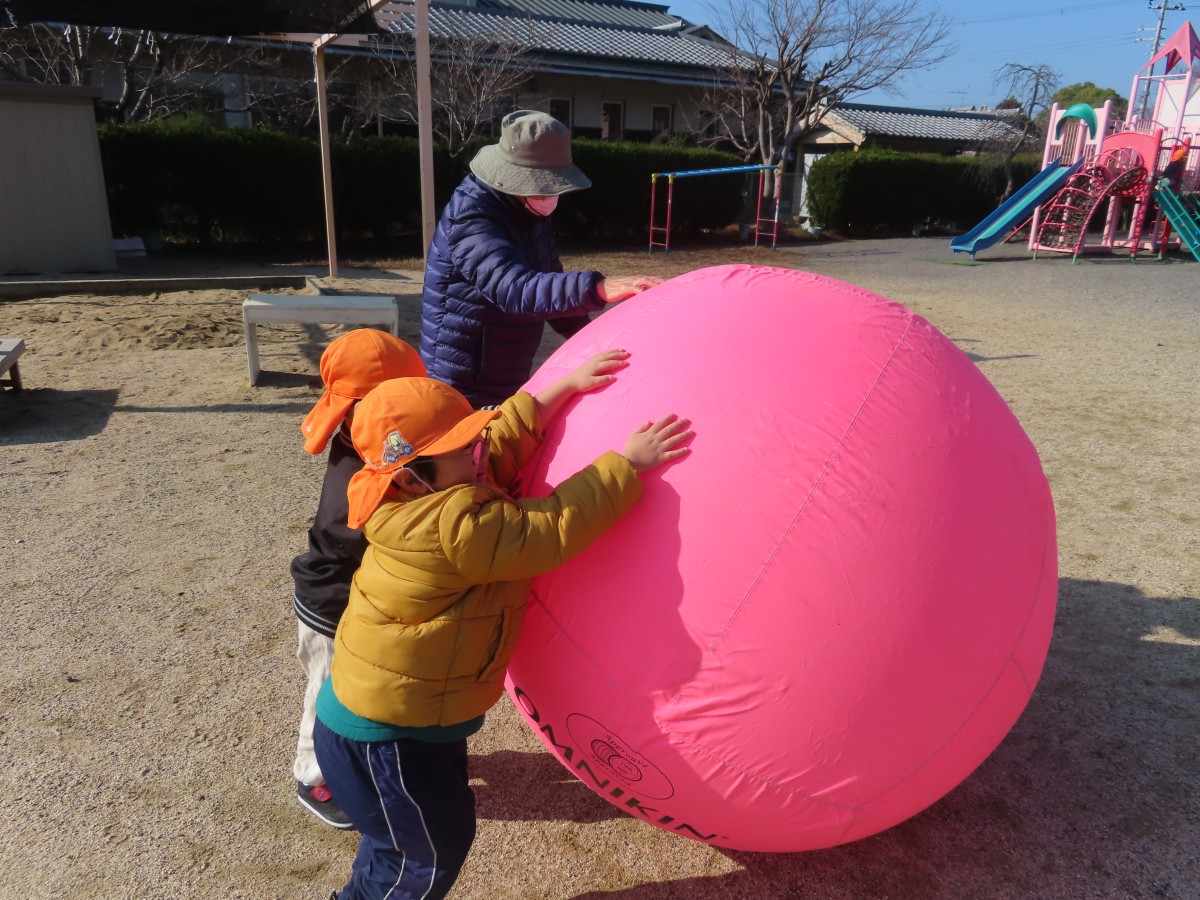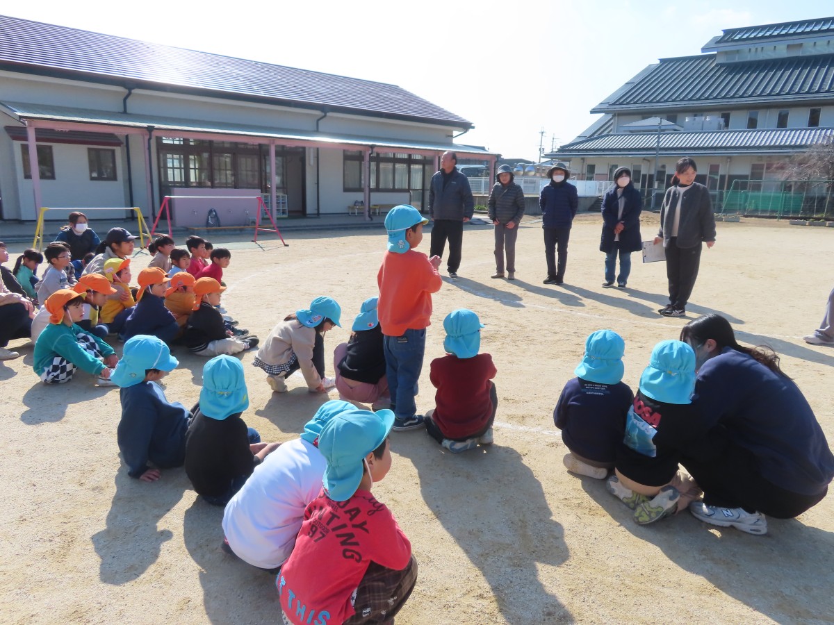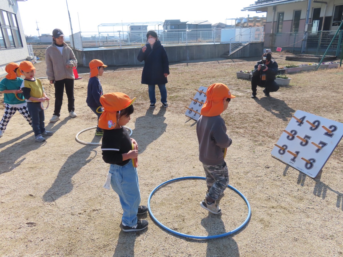 2月13日(金)にニュースポーツ交流会をしました。山田園小教育後援会のみなさんにお越しいただき、3歳児は輪投げとキンボール、4歳児はビーンボウリングとワンツーシュート、5歳児はグランドゴルフを楽しみました。初めての遊びも後援会のみなさんに優しく教えていただき、元気いっぱ気持ちよく体を動かして遊びました。