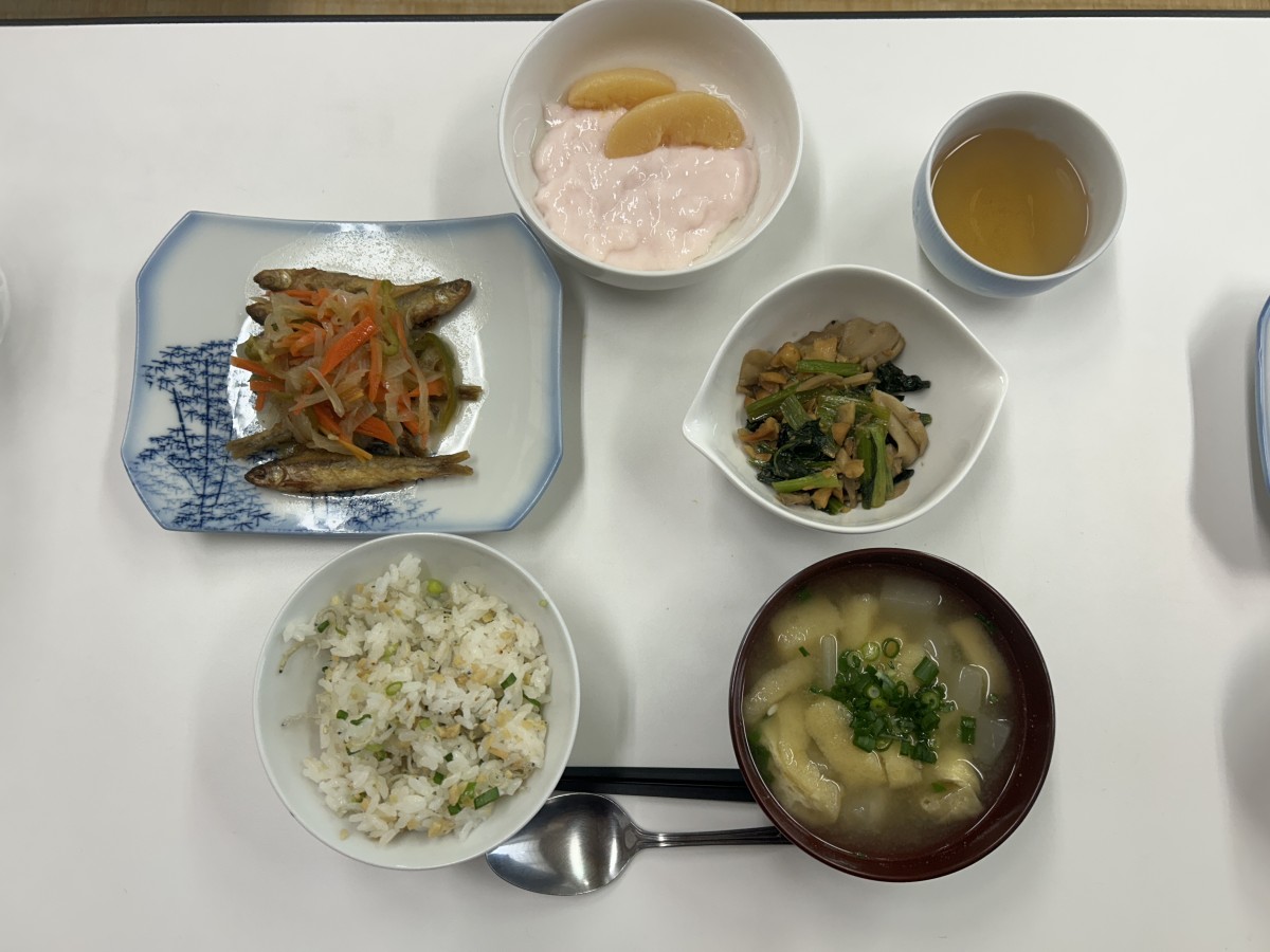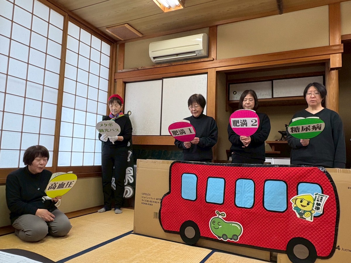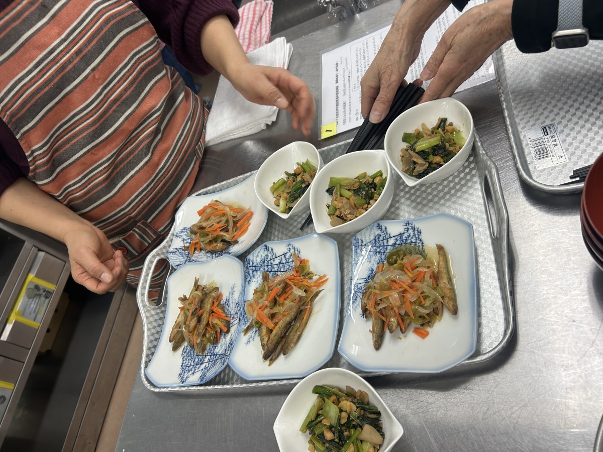 健康推進委員連絡協議会山田学区,1月29日、第2回目の食育講座を開催しました。郷土に伝わる、わかさぎ(今回はモロコ)や、カブを使ったお講汁を作りました。講座の前に、生活習慣病予防を、わかっていただこうと寸劇を見ていただきました。最初は、焼きわかさぎの南蛮漬けを予定していましたが、突如手に入らず、ホンモロコを使用し南蛮漬けをつくることになりました。また、地場の小松菜を使いナッツとのニンニク炒めナッツとニンニクがよく合い匂いを感じさせない1品になりました。お講汁はカブのみそ汁で懐かしい味でした。