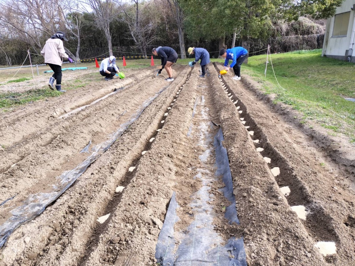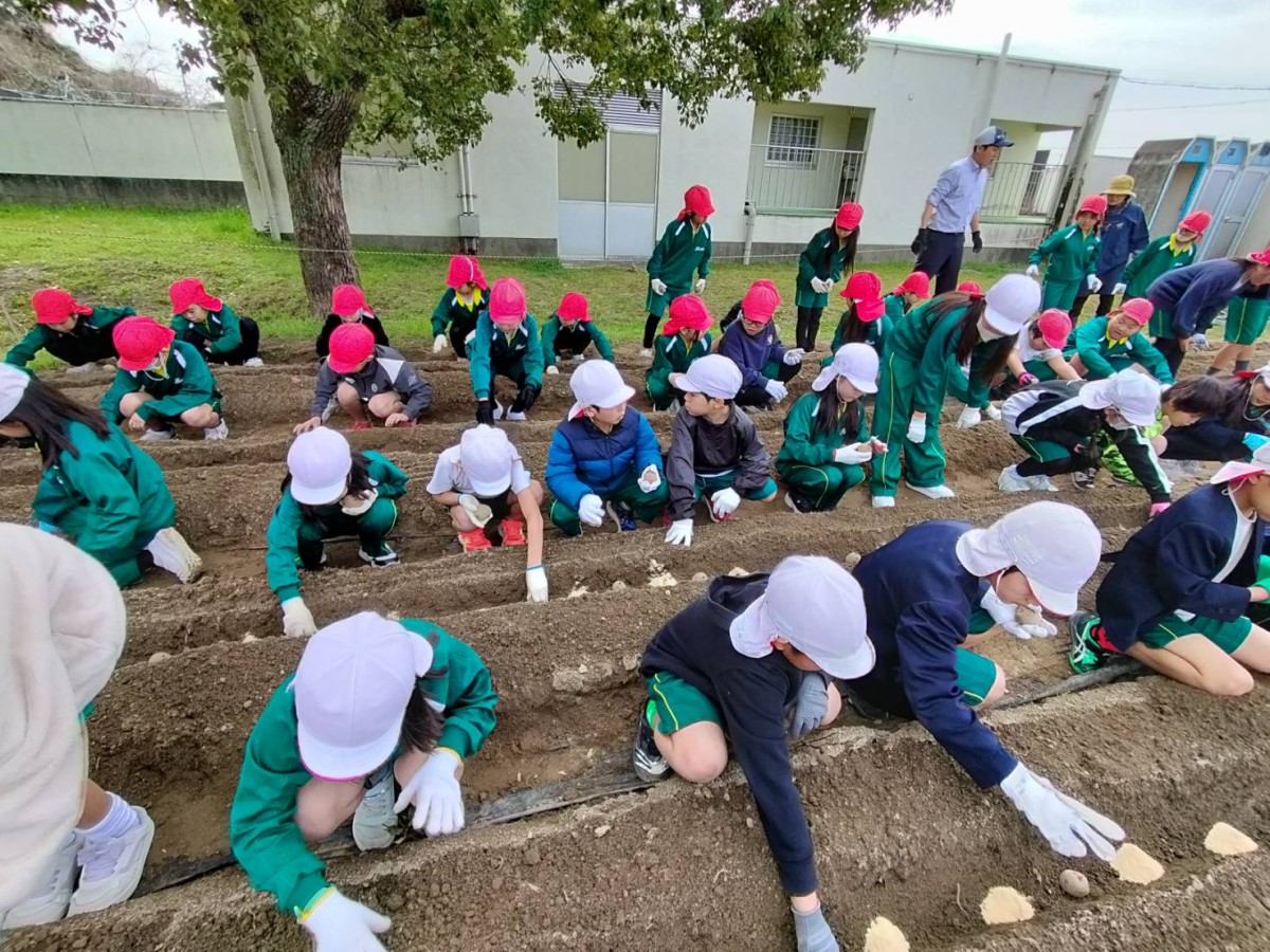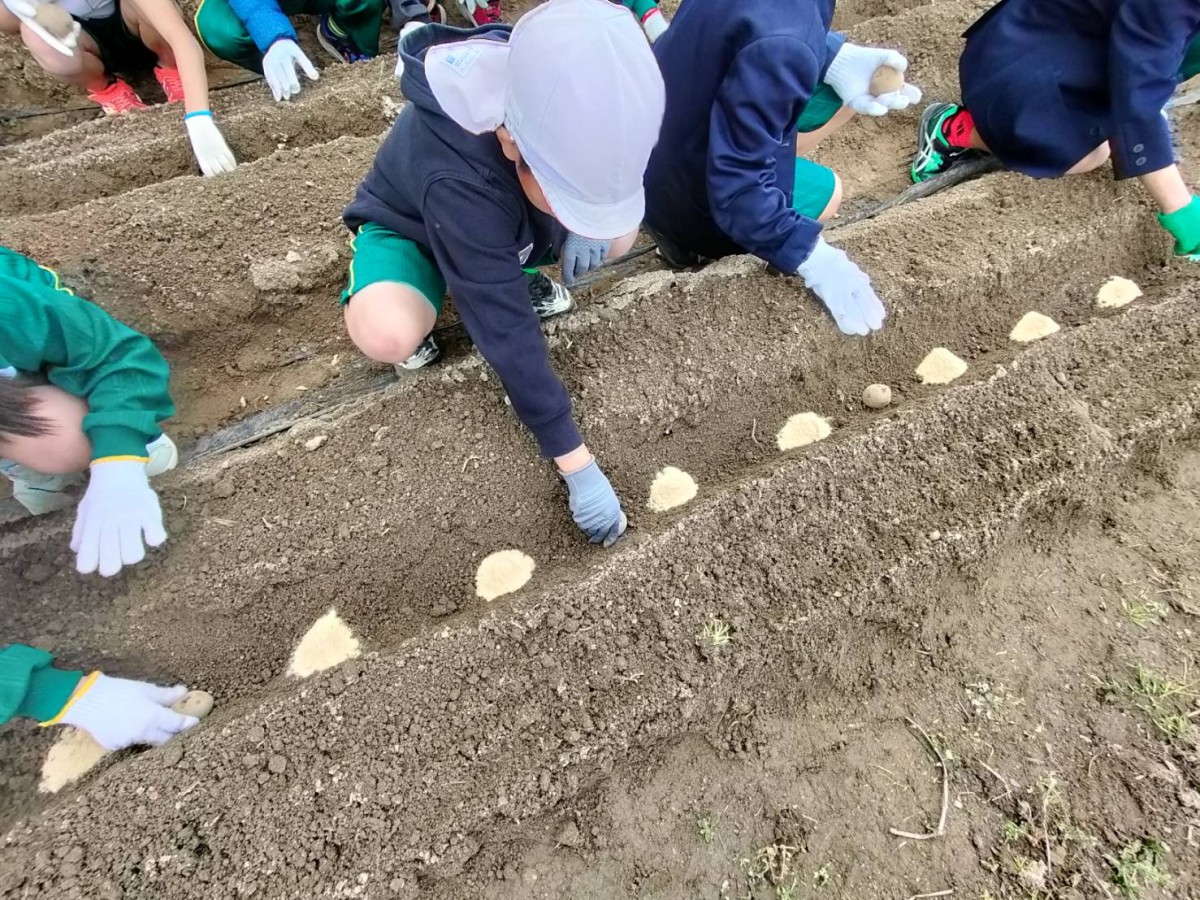 品種は【だんしゃく】と【キタアカリ】です。前日にきれいに畝作りされた畑に30cm間隔で種芋の芽を上にして置きました。その上に土を5cmくらい優しくかぶせました。芋と芋の間には「8-8-8」という肥料と米糠を置き、土をならしました。ひとり3~4個ずつ植えることが出来ました。子ども達が教室に帰ってから、先生方にもお手伝いいただいて畝にマルチシートをかぶせました。発芽するまでは雨などの水気は厳禁だそうで、シートが風でめくれないように土をかぶせて押さえました。マルチシートが盛り上がって発芽したのがわかったら、シートに切れ目を入れて太陽に当てて水やりをするというお話でした。いつ頃発芽するのか、どんなふうに成育するのか楽しみですね。発芽を一番に見つけるのは誰かな?収穫は子ども達が4年生になった6月中旬頃の予定です。それまで頑張って観察して欲しいというのが久泉会長さんの願いです。畑作りや準備などたくさんのご支援ご協力をありがとうございました。(地域コーディネーター 中島民恵)