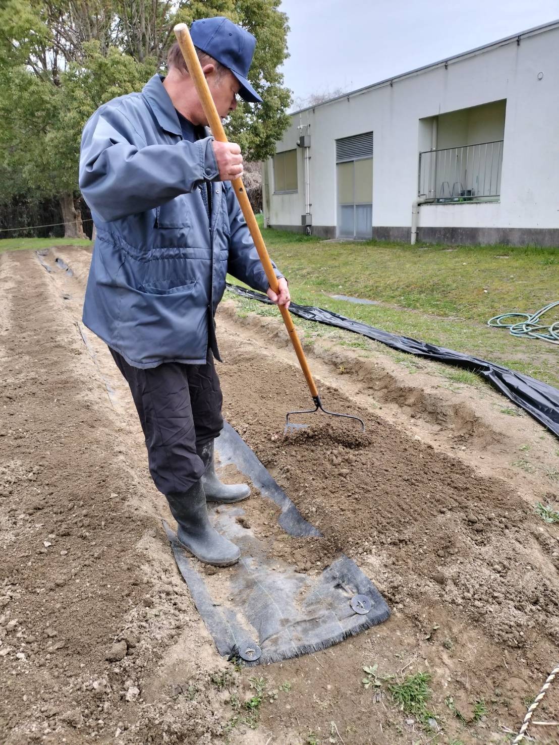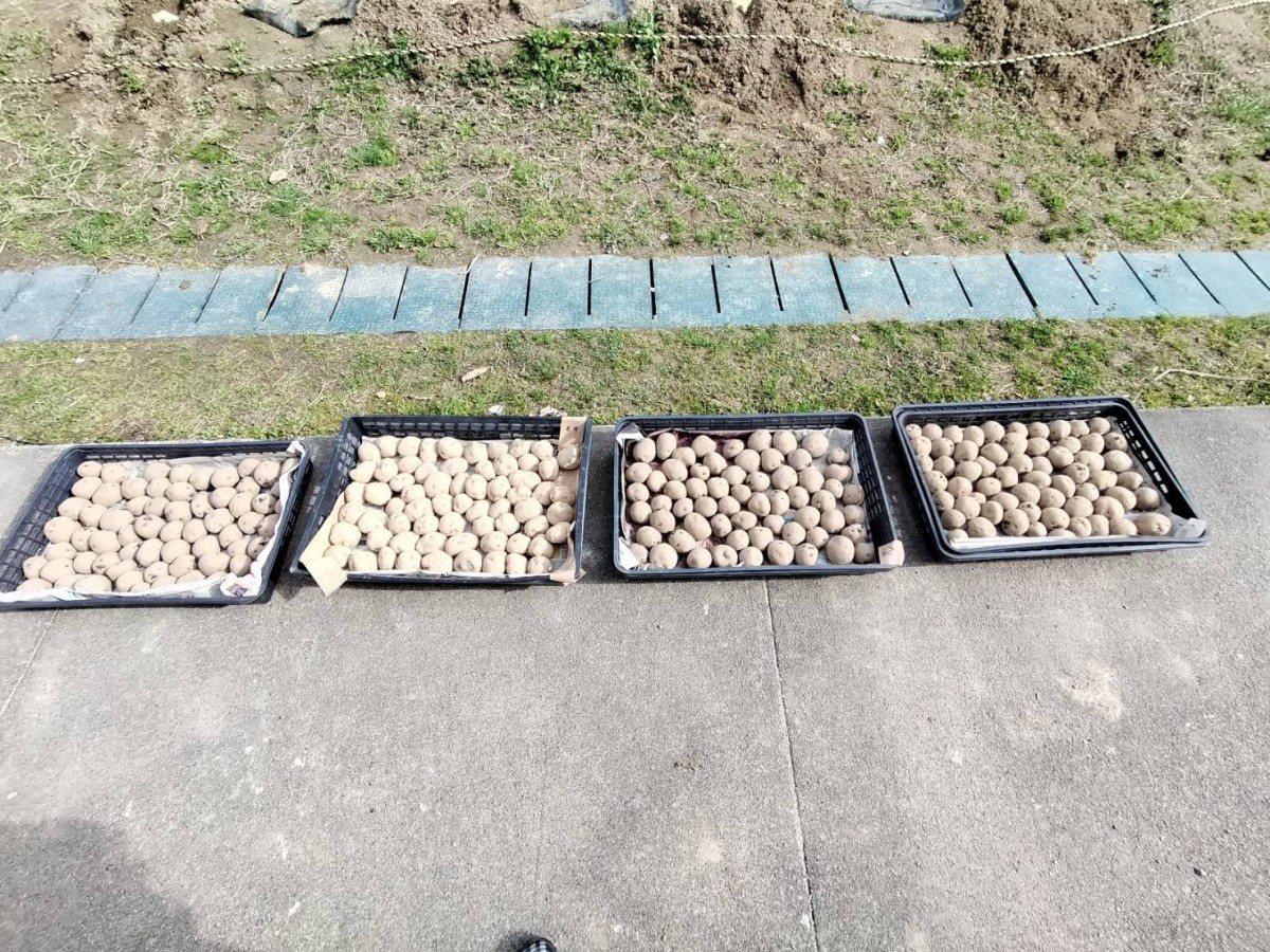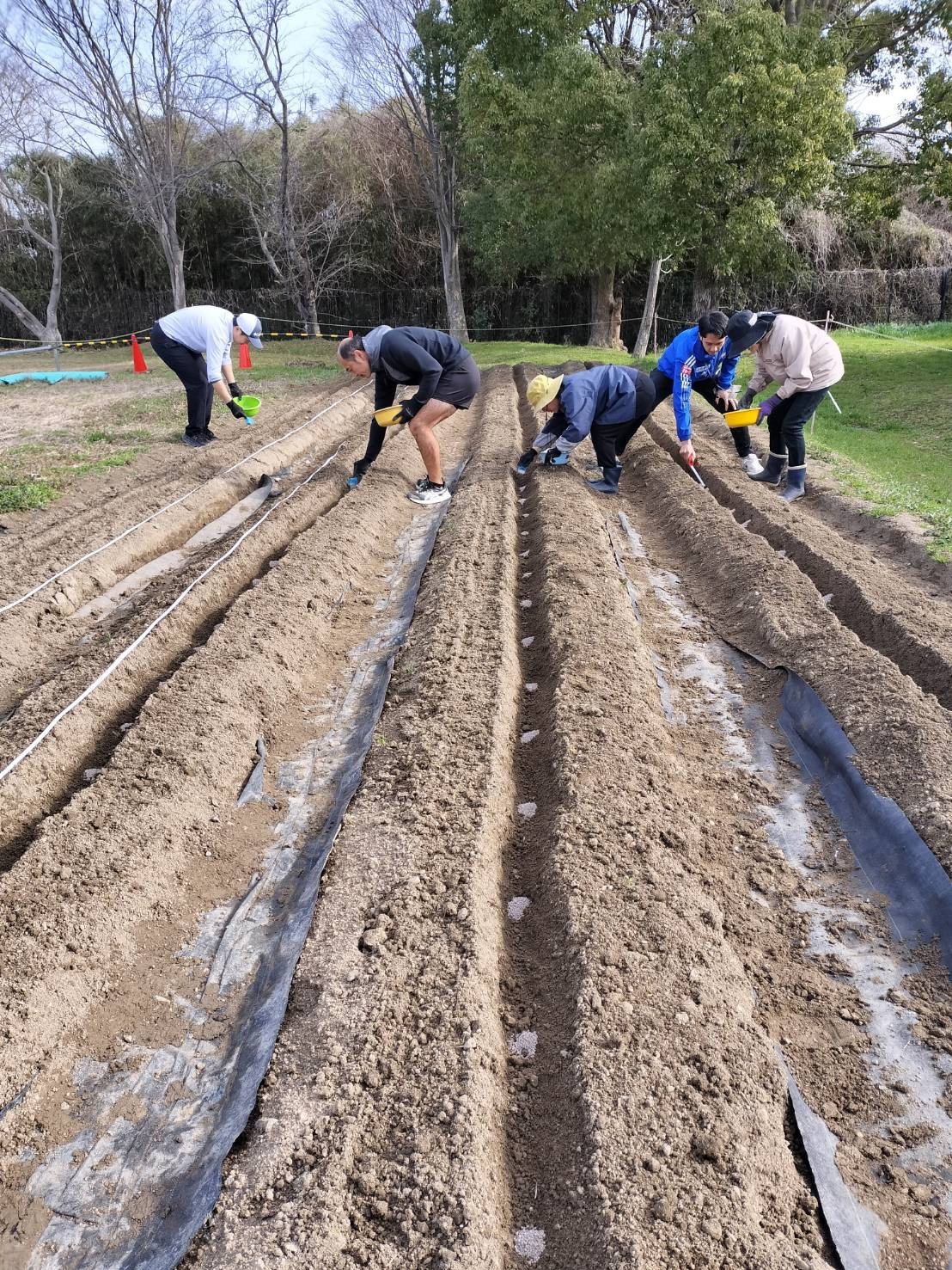 品種は【だんしゃく】と【キタアカリ】です。前日にきれいに畝作りされた畑に30cm間隔で種芋の芽を上にして置きました。その上に土を5cmくらい優しくかぶせました。芋と芋の間には「8-8-8」という肥料と米糠を置き、土をならしました。ひとり3~4個ずつ植えることが出来ました。子ども達が教室に帰ってから、先生方にもお手伝いいただいて畝にマルチシートをかぶせました。発芽するまでは雨などの水気は厳禁だそうで、シートが風でめくれないように土をかぶせて押さえました。マルチシートが盛り上がって発芽したのがわかったら、シートに切れ目を入れて太陽に当てて水やりをするというお話でした。いつ頃発芽するのか、どんなふうに成育するのか楽しみですね。発芽を一番に見つけるのは誰かな?収穫は子ども達が4年生になった6月中旬頃の予定です。それまで頑張って観察して欲しいというのが久泉会長さんの願いです。畑作りや準備などたくさんのご支援ご協力をありがとうございました。(地域コーディネーター 中島民恵)