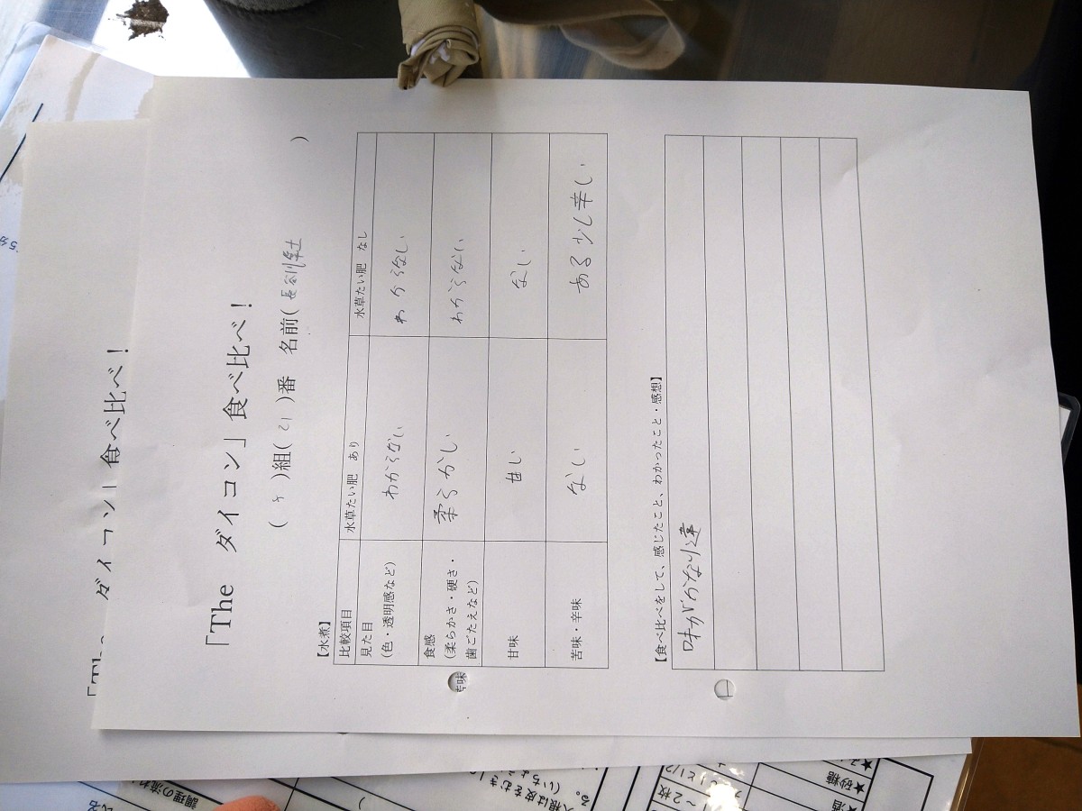 1年生は、家庭科の時間に「ブリ大根」ではなく「サケ大根」を調理実習しました。琵琶湖の水草堆肥を入れた大根、入れなかった大根を同じように調理した状態で食べ比べてみました。それを記録用紙に書き、みんなでまとめました。どんな結果だったのかな?