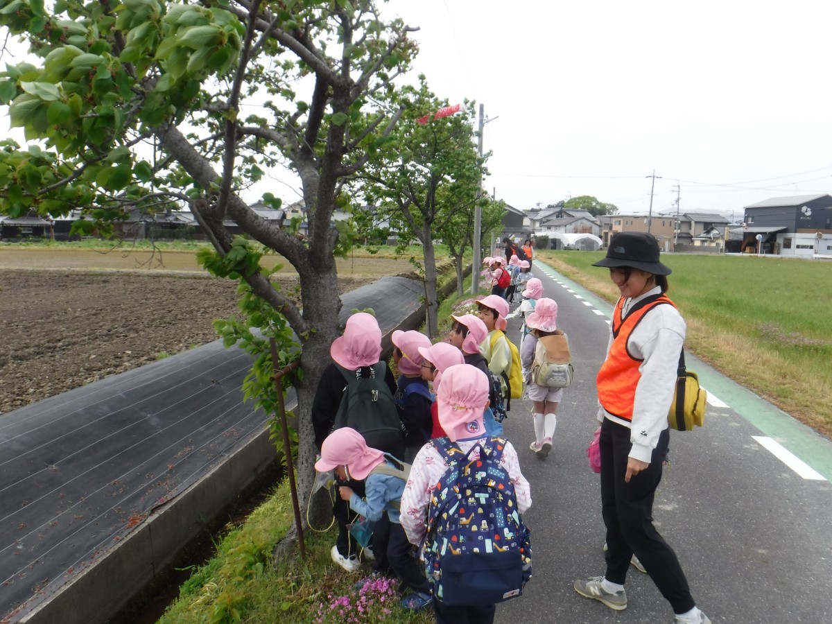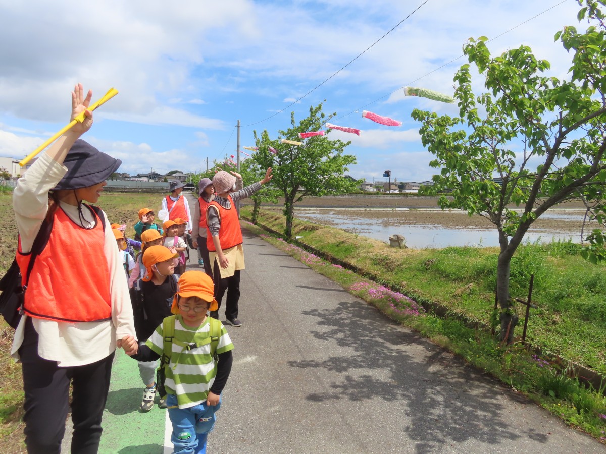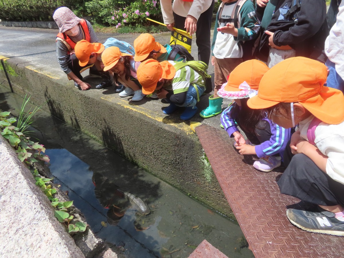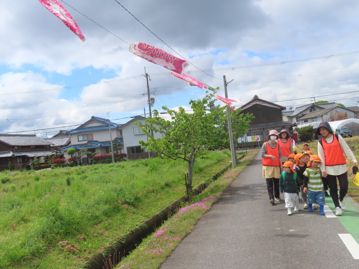 「いっぱいこいのぼりが泳いでる!」「大好きなピンクのこいのぼり見つけた!」「あっちにみどりのこいのぼりもあるで!」いろとりどりのたくさんのこいのぼりに大喜びのこどもたちでした。道の脇に咲いている春の草花を見つけて匂いを嗅いでみたり、行き帰りの道中で側溝にいるナマズを見つけたりたくさんの発見に目をキラキラさせていました。