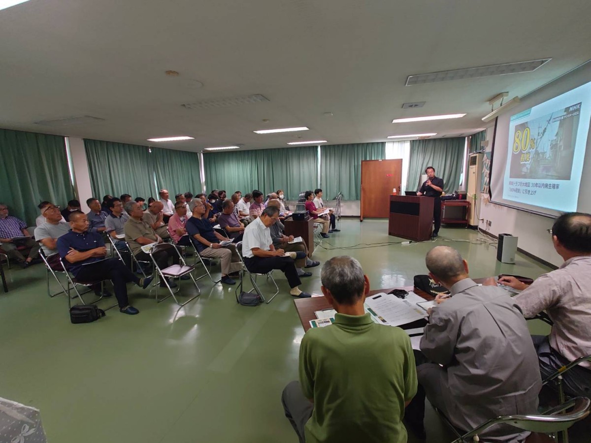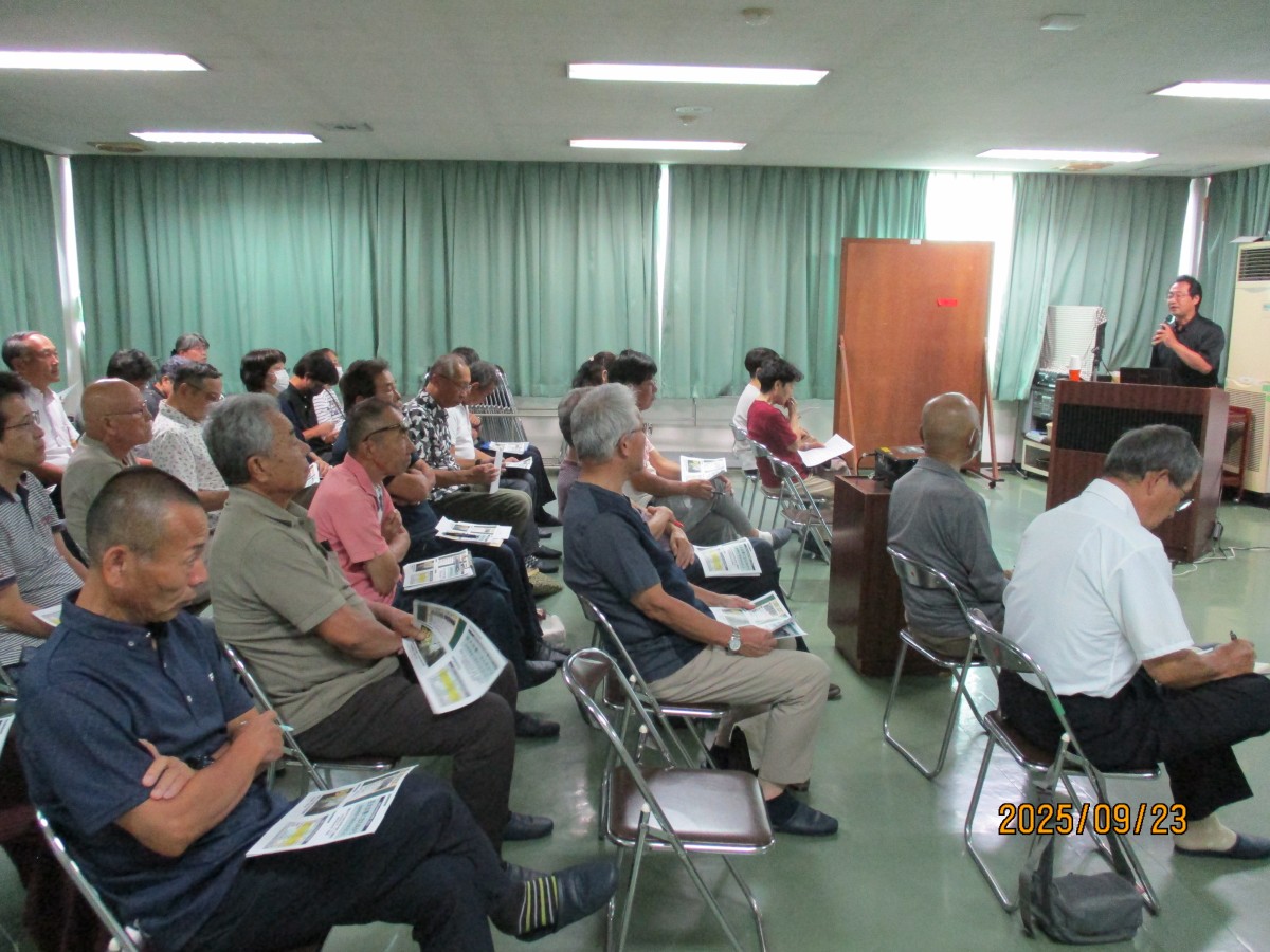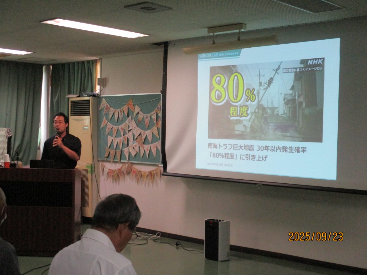 9月23日防災講演会を開催しました。各町から町内会長、防災担当者を主に43名の参加がありました。開会に先立ち91年前の室戸台風犠牲者への黙とうが行なわれ関西大学近藤教授を講師に招いて「いま山田学区で求められること」のテーマで災害リスクに対する認識を町内隅々まで浸透させる、防災への取組を持続させる、手応えを得る機会を増やす事が大切で南海トラフ地震の際滋賀は公的レスキューは殆ど無いのでやるべき事を速やかにやる必要があるとの話に感銘を受けました。地区防災計画の地震目安6→5変更の背景や共助を平素から行う必要の話の中で町内で高齢者宅の家具等の固定を行なってほしいとの事でした。防災教育と防災活動の両輪を繋げて未来の人材を育てる事を意識してくださいとの話でした。質疑応答では備蓄飲料水の取扱いやAEDの共有、避難から共助に向かう件等熱心に聞き入っていました。参加された皆さんお疲れ様でした。