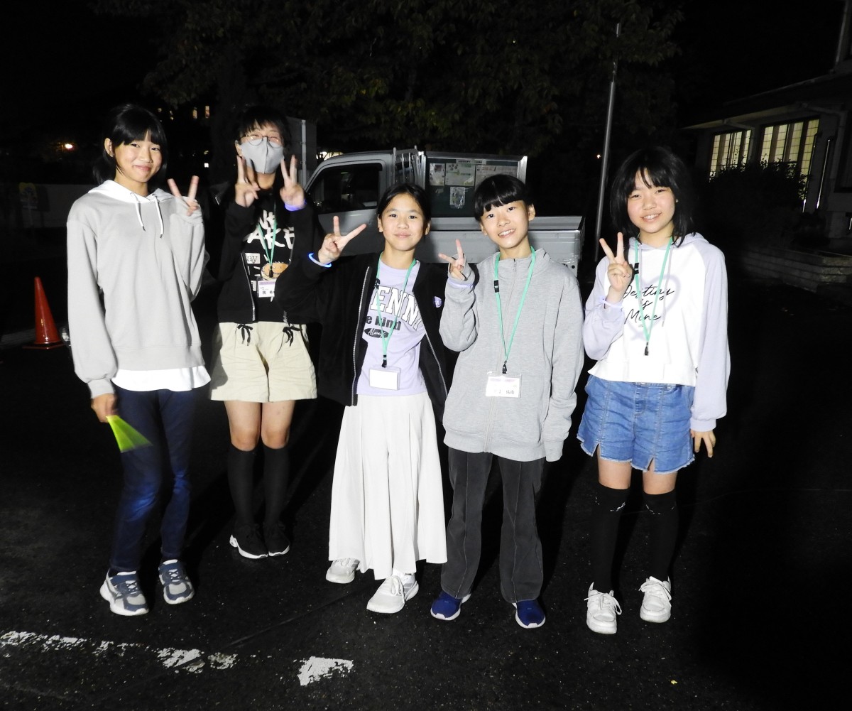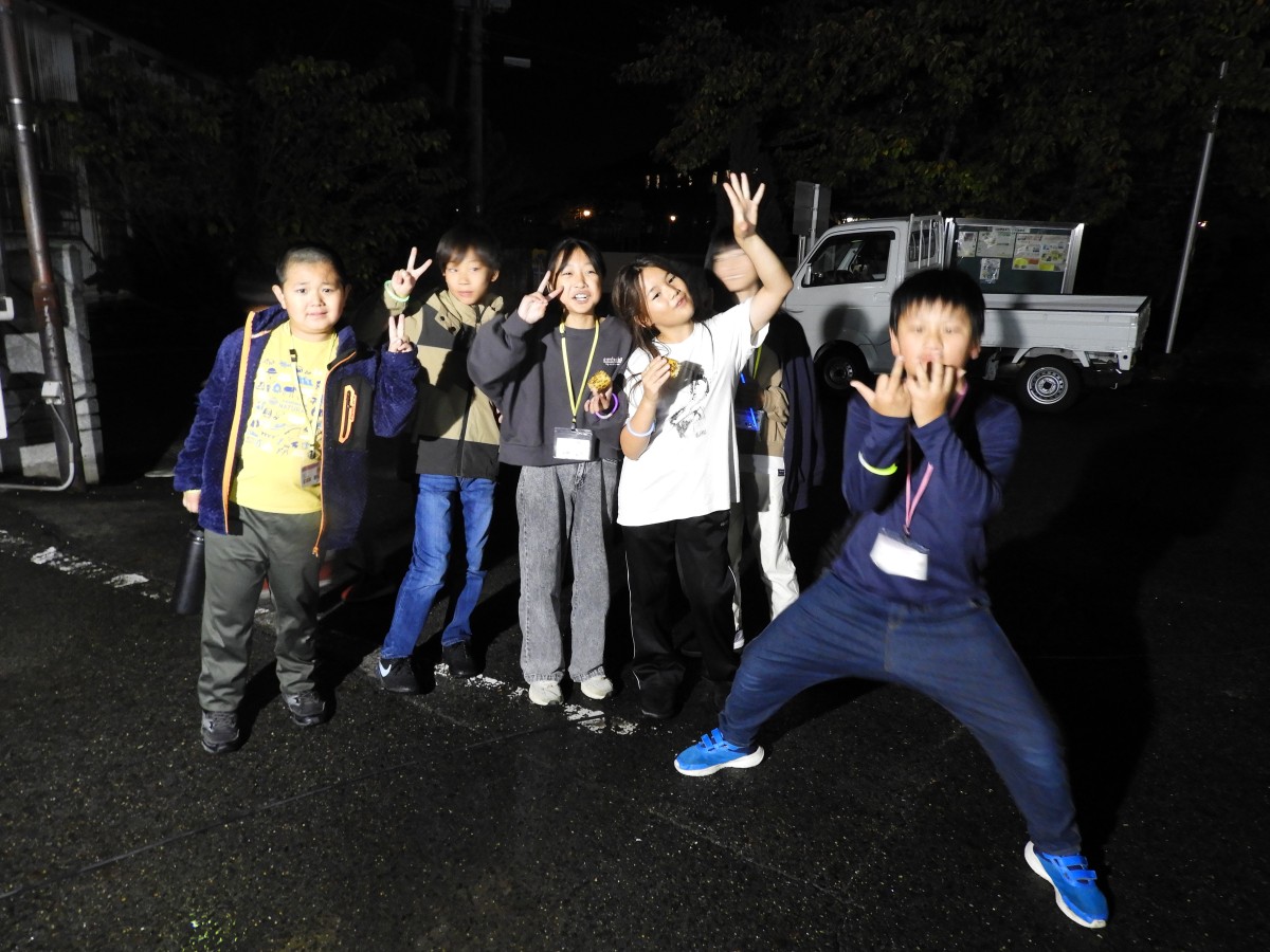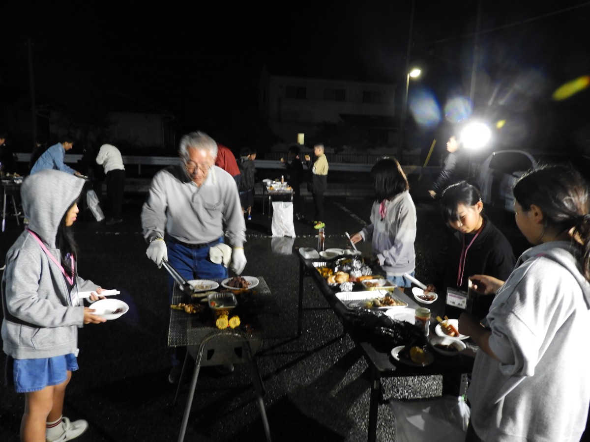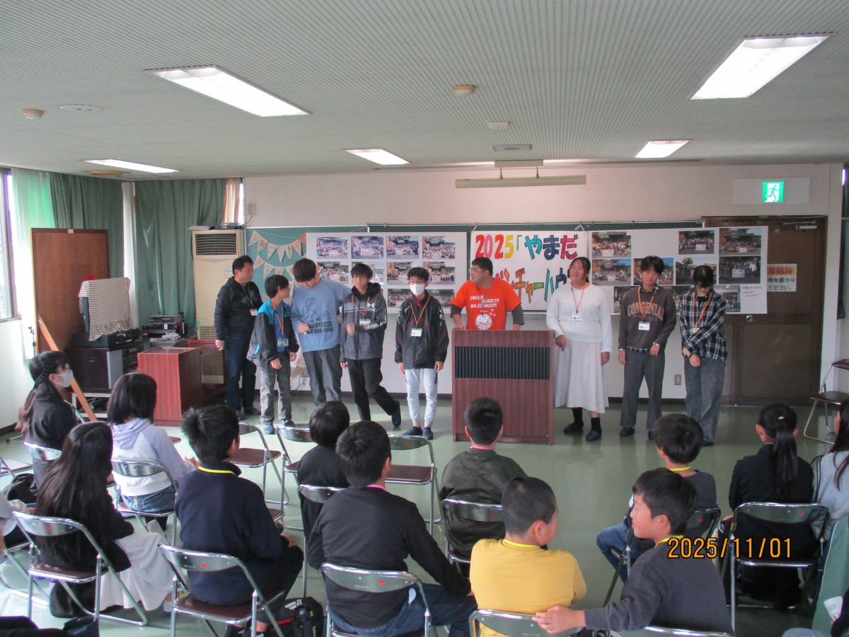 11月1日(土)中学生の企画グループ、Yamada Challenger Club、略して「YCC」8名と度胸試しサポーターの3名、4~6年の小学生23名が集合し、やまだアドベンチャーハウスを開催しました。今年の企画5項目の内容になりました。①「山田まちづくりセンターでゲーム!」②「ミニ運動会」③夕食に「BBQ」④「度胸試し」⑤「かまど体験」と盛り沢山です。ゲーム内容、景品、ミニ運動会の競技、BBQ、かまど体験のメニュー全てYCCメンバーが数回の企画会議で考え、準備をしました。前日の天気は大雨だったので開催当日の天候を心配していましたが翌朝は雨が上がりました。開催当日は9:00受付、参加者の小学生はワクワクで朝から元気いっぱいでした。午前中は山田まちづくりセンター(以後、まちセン)で、毎年恒例の大パネルと共に集合写真撮影、その後は、狼ゲーム、ビンゴ大会!景品選びをして、終始大盛り上がりでした。和室に移動し、みんなでお昼ご飯のお弁当を食べました。お昼からはミニ運動会!公用バスで13:00に出発➡山田小学校 体育館へ移動です。YCCメンバーより運動会競技の説明、準備運動にラジオ体操をしました。各チームに分かれて・玉入れ・的当て・五色綱引き、休憩をはさんで・障害物競走・ここからは個人戦で、・借り物(人)競争・パン食い競争をしました。熱戦で個々熱い思いもある中、怪我無く競技も終了して、順位ごとに景品があり、小学生達は喜んでいました。16:30、公用バスでまちセンへ出発。まちセンでは、夕食のBBQ!学区の協力者さんの力をお借りしてコンロ5台に炭の火起こしをし、食材の準備をして下さっていました。お肉、焼き鳥、アヒージョ、じゃがバター、フランクフルト、まるごと玉ねぎ、焼き芋。BBQもひと段落し、「度胸試し」YCCメンバーは、おどかし用のコスチュームに変身し山田八幡宮へ向かいました。小学生達は班に分かれ、時差で神社へ。並行し、「かまど体験」マシュマロを炙って、トロトロマシュマロを美味しそうに食べていました。最後は閉会式をしました。今年の中学生が次世代を担う頼もしい姿勢を小学生に影響を与えてくれました。また、早朝から夜に至るまでお手伝いいただいた地域の皆さまのおかげで開催できました。ありがとうございました。