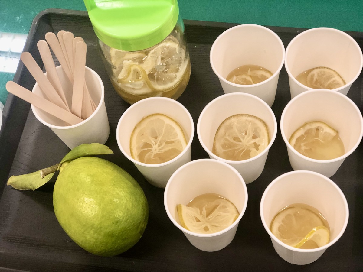 氷砂糖とはちみつで漬けた璃の香シロップは、炭酸水や水、お湯で割って試食しました。ホットレモネードが一番合うと満場一致でした。