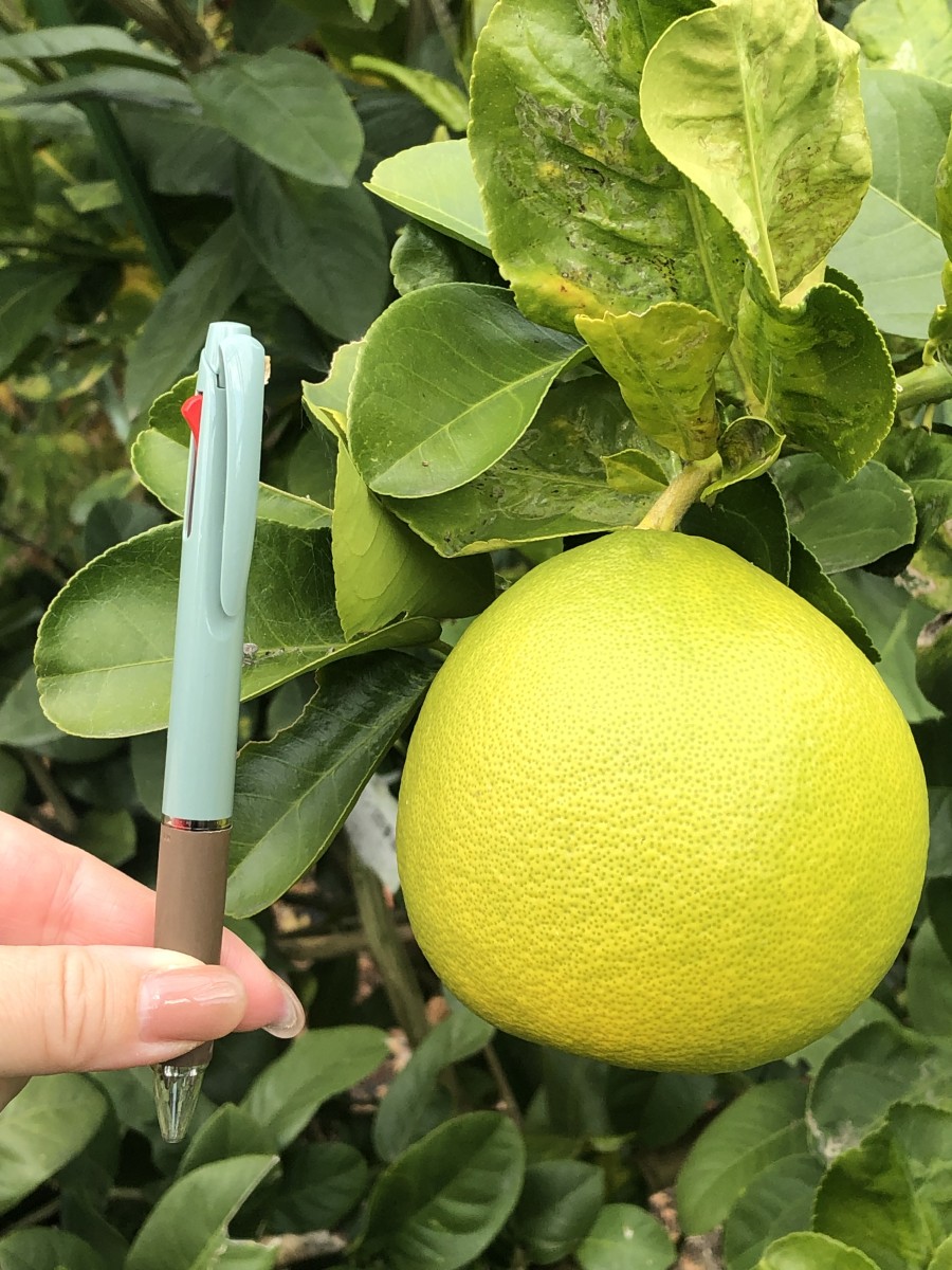 実になっているジャンボレモンを間近で見て、迫力のある大きさにとても驚きました。皮がすごく厚いようで、加工するのが大変だったそうです。