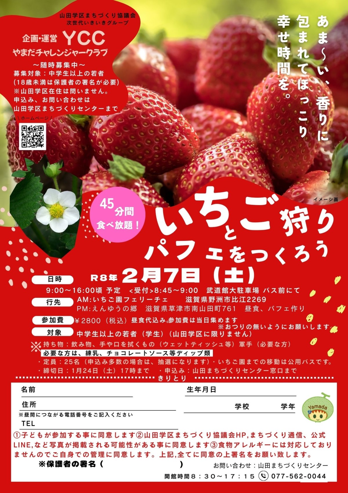 ・定員25名(申込み多数の場合は、抽選になります)・いちご園までの移動はは公用バスです・申込は山田まちづくりセンター窓口
