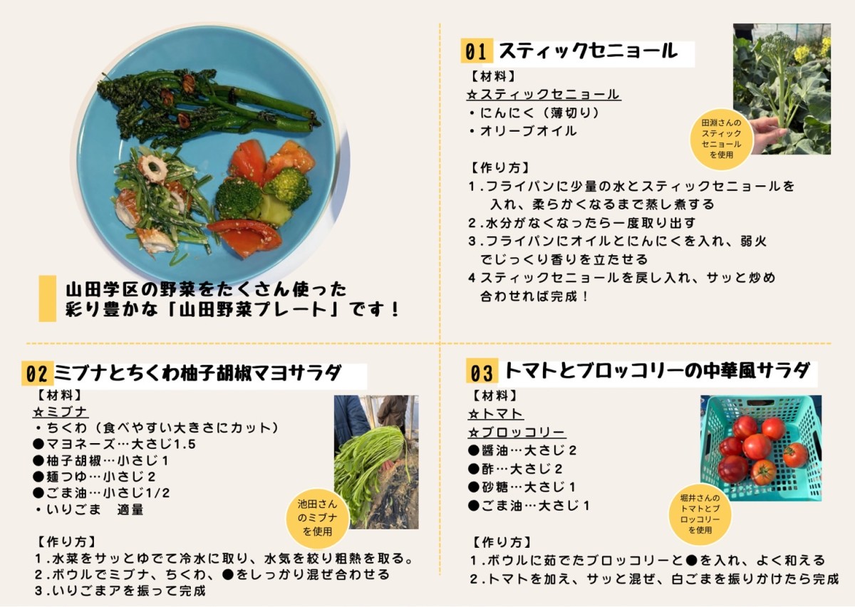 すぐにイベント企画として形にすることができなかったため、まずは私たちでアレンジをし、各農家さんからいただいたお野菜を使って「山田野菜が主役の晩ごはん」を作ってみました!今後は、このようにその場でいただいたお野菜を「お弁当」という形にして、山田野菜の魅力を発信していけるイベントへとつなげていきたいと考えております。