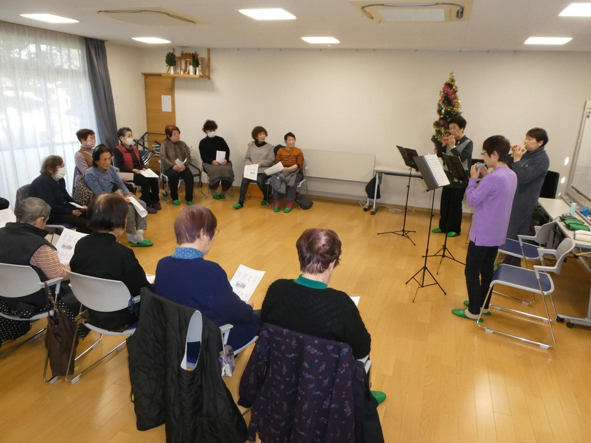 まず、ゲストボランティアの「アンサンブル優・優(ゆうゆう)」の3名の方に、この日のために用意していただいたクリスマスソングや、みんなが歌える唱歌・童謡、外国生まれの曲などを演奏していただきました。