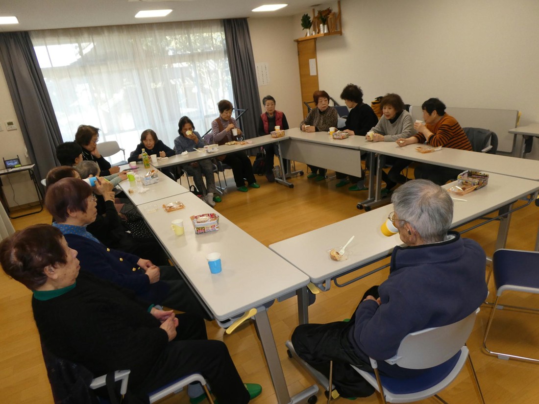 北山田ふれあいサロンでは、月1回、毎週火曜日に行っている「いきいき百歳体操」のあと、「楽しい語らいティータイム」というお楽しみ会を催しています。