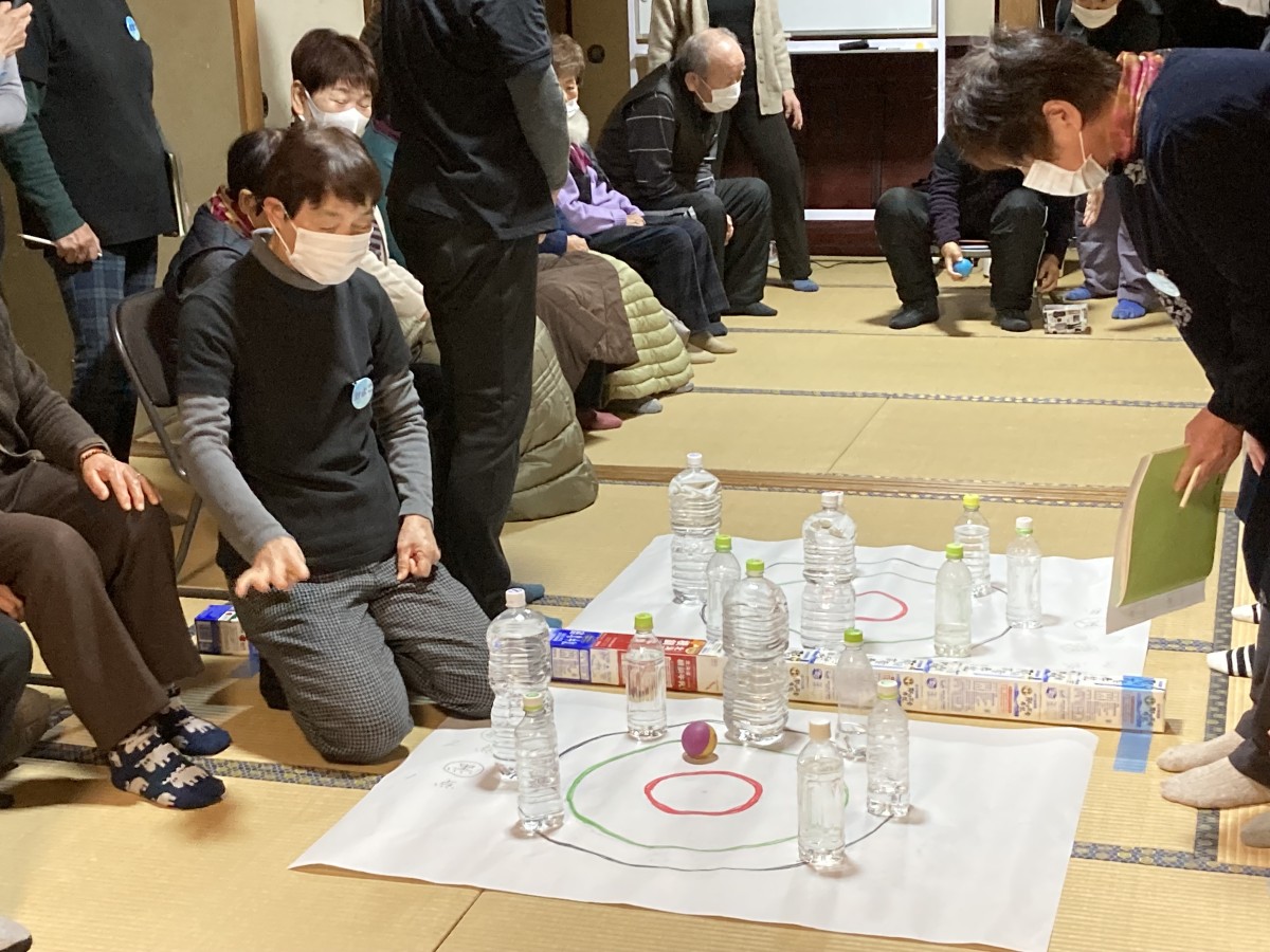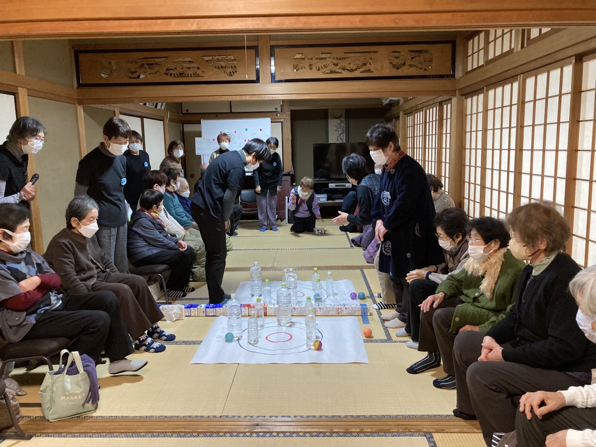 木川町宅老所 あおばなの家「カーリングゲーム」 木川町 宅老所あおばなの家で、カーリングゲームを行いました。ぺットボトルをたてて 障害物にし、グラウンドゴルフのボールを転がして、ゴールをねらうゲームです。チーム対抗にしたので、利用者の皆さんは、高得点をねらって夢中でした。歓声と、拍手のなか、あっという間に時間がたちました。楽しかったです。